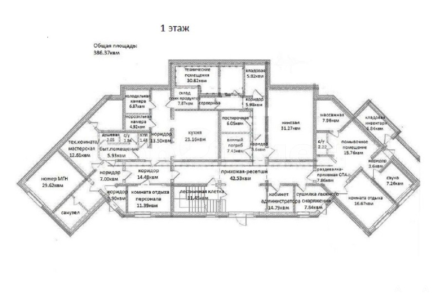 1 этаж: Кухня- бар, кинозал, Сауна и массажная, винный погреб, постирочная, морозильная и холодильная камеры, сушилка для лыжного инвентаря