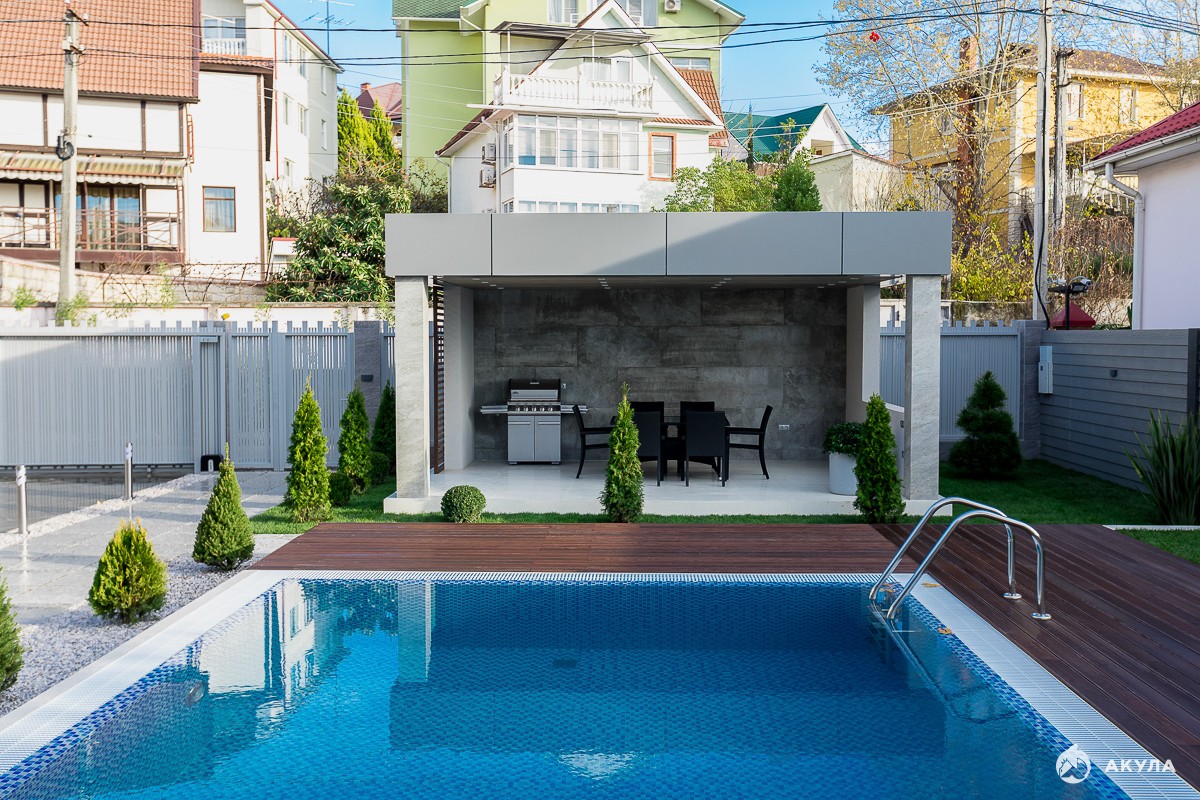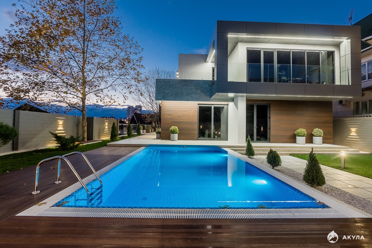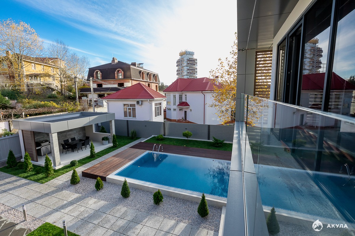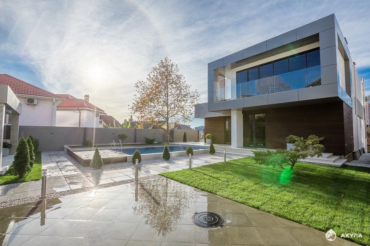 Дом постройки 2017 года, расположен на улице Анапской, в 800 метрах от моря, в тихом переулке, все соседи построились, центральные коммуникации, интернет оптиковолокно, только закончены отделочные фасадные работы, три уровня, Цокольный этаж – полностью укомплектованная и отделанная котельная + насосная, отдельно техническое помещение для оборудования бассейна, помещение под сауну или другое назначение – 75 м2, Первый этаж – холл, гардеробная, санузел, подсобное/техпомещение , спальня/кабинет, кухня-столовая, гостиная – открытое помещение, предусматривающее разделение по зонам – площадь первого этажа 175 м2, из столовой выход на большую террасу, из гостиной – выход на террасу к бассейну. На втором этаже – 4 спальни площадью от 25 до 32 м2, в каждой спальне возможен индивидуальный санузел санузел, большая терраса по периметру второго этажа с видом на море. При желании Покупателя возможно сделать выход на эксплуатируемую кровлю и обустройство. В доме смонтирована система водоснабжения и канализации, на первом жилом этаже теплый пол на всей площади, оштукатурены стены, сделана стяжка. На участке площадью 8 соток, декоративная подсветка, в отделке используется дорогие отделочные материалы: натуральный камень, керамогранит, декоративная штукатурка, стекло, экзотическое дерево; окна и проемы – алюминиевый профиль с эксклюзивным покрытием, солнцезащитное остекление, по периметру террас и балконов – безрамочное панорамное остекление. Во дворе переливной подогреваемый бассейн размером 7х4 м с противотоком, системой ультрафиолетовой и химической обработки воды, беседка в стиле дома, укомплектованная грилем, мебелью и всеми коммуникациями.