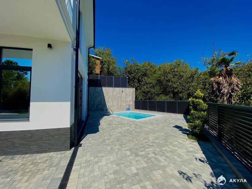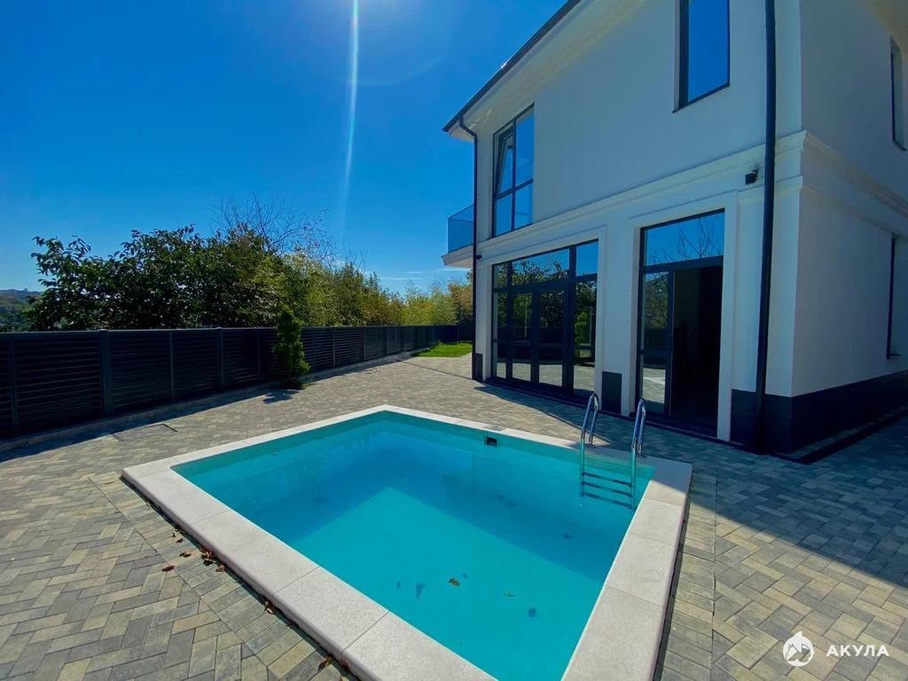 Продается новый дом с бассейном. Дом построен на участке 5 соток, в доме два этажа. На первом этаже большая кухня-гостиная, спальная комната, ванная комната и котельная. На втором этаже три спальные комнаты, две из которых с просторными террасами и две ванные комнаты.