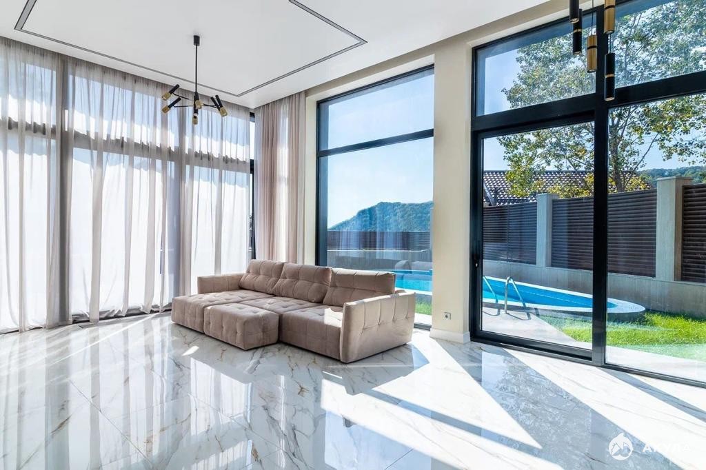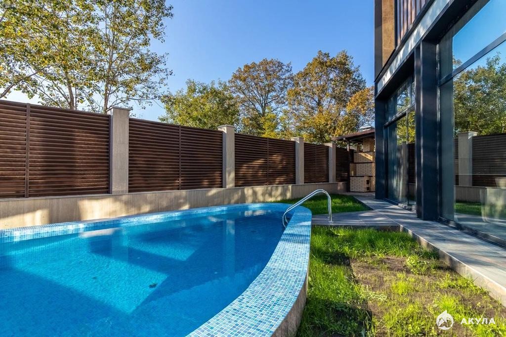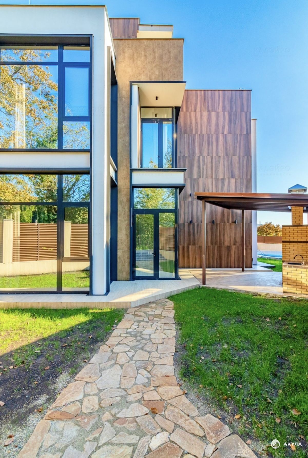 Дом монолитно-каркасный с блочным заполнением. Вентилируемый фасад облицован керамогранитом. Высота потолков 4м, двери высотой 3, 6м. В доме выполнен авторский, дизайнерский ремонт из высококачественных отделочных материалов. Большие панорамные окна в пол. По всему дому уложен теплый пол, установлены кондиционеры Mitsubishi. Коммуникации: свет 15кВт, вода-скважина, канализация-ЛОС, газ (котел Viessmann). Удобная планировка: гостиная с выходом к бассейну, несколько комнат, гардеробные, санузлы с душем и ванной. На участке переливной бассейн 3, 5х7 глубиной 1, 8 м, ландшафтное озеленение, гараж, парковка на 4 автомобиля, зона барбекю.