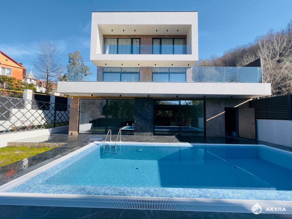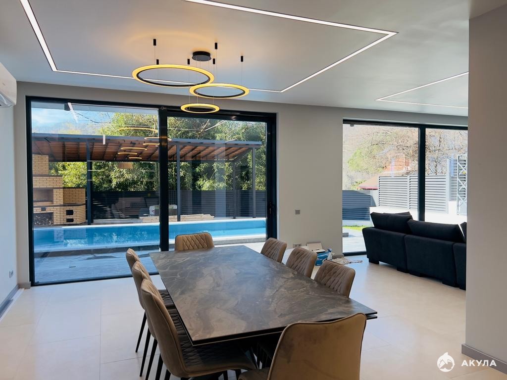Дом монолитно-каркасный с блочным заполнением. Вентилируемый фасад облицован керамогранитом. В доме выполнен авторский, дизайнерский ремонт из высококачественных отделочных материалов. Панорамные окна из алюминиевого профиля в пол. По всему дому уложен теплый пол, установлены кондиционеры Mitsubishi. Коммуникации: свет 15кВт, вода-скважина, канализация-ЛОС, газ (котел Viessmann). Удобная планировка. На участке переливной, подогреваемый бассейн 3, 5х7 глубиной 1, 8 м, ландшафтное озеленение, парковка на 3 автомобиля, зона барбекю.