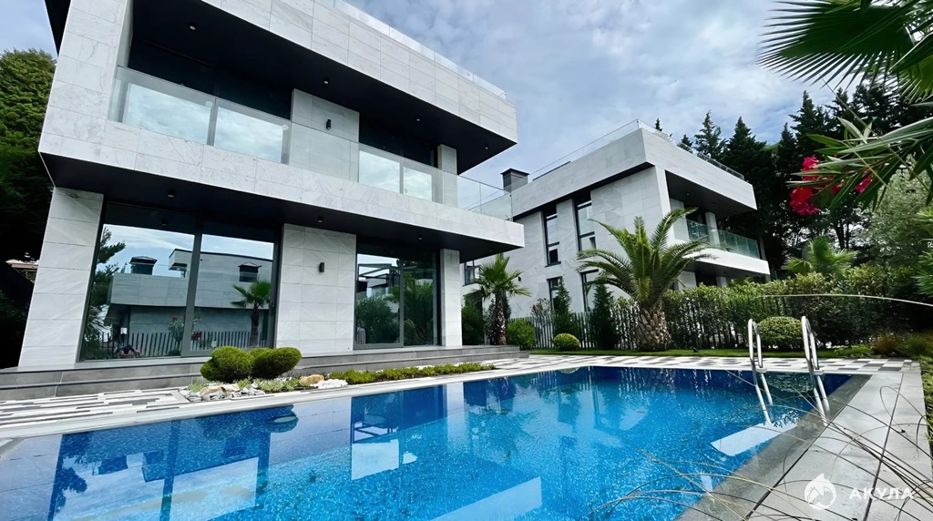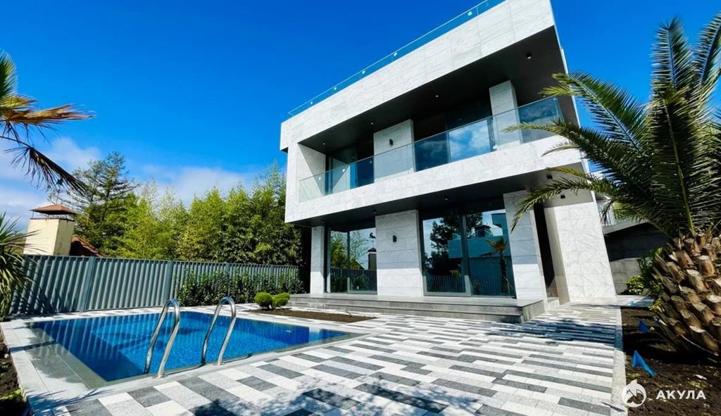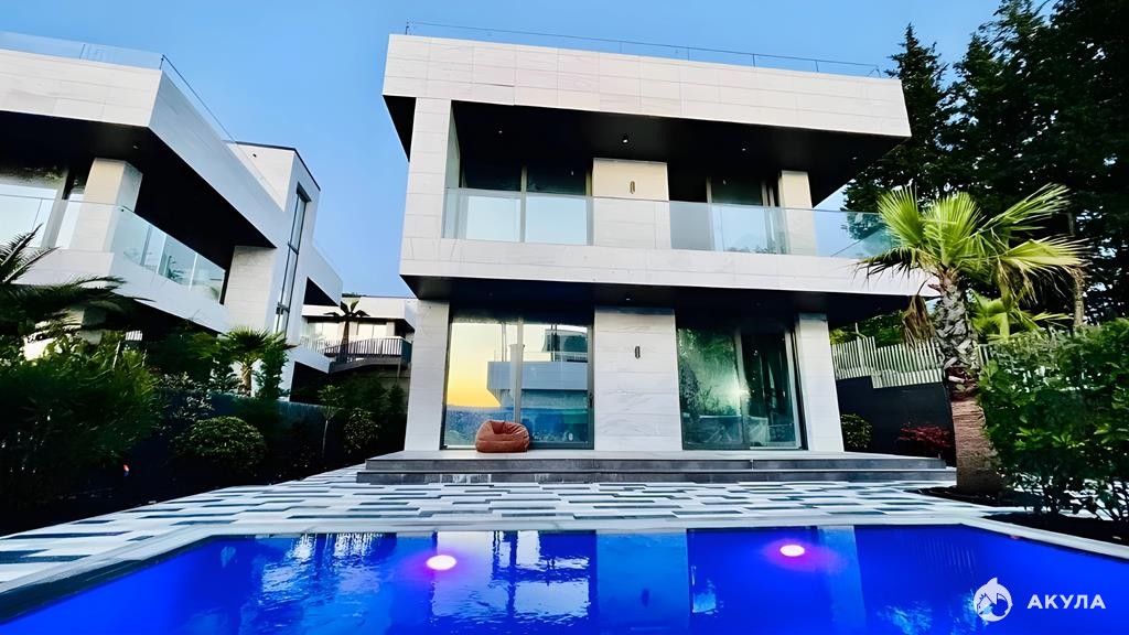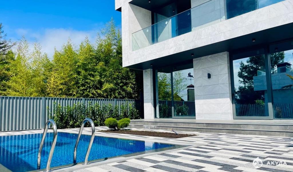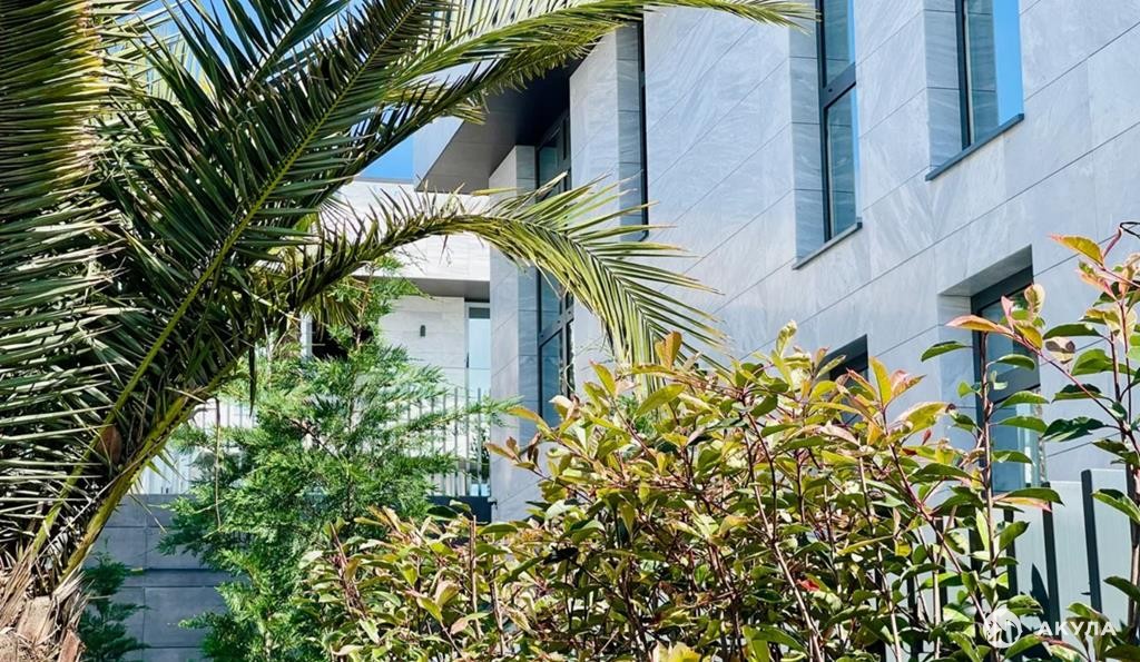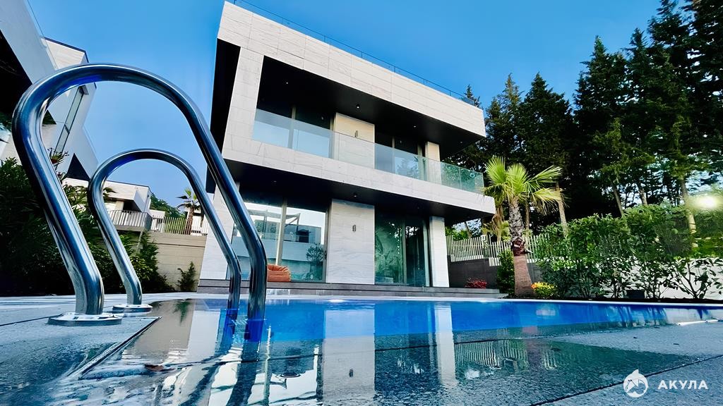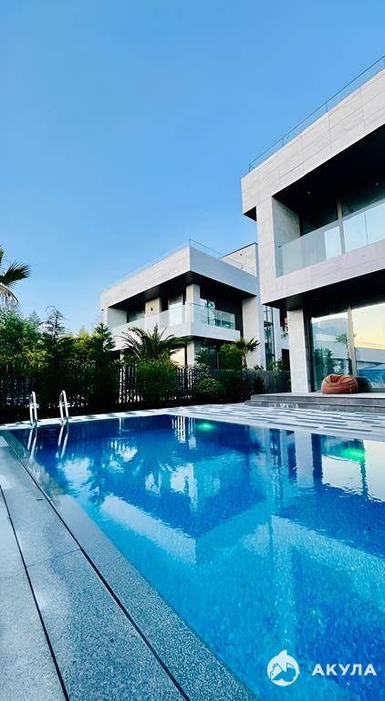 У дома собственный бассейн, благоустроенная придомовая территория. Дом сдается с черновой отделкой с подключёнными коммуникациями. В отделке домов используются только премиальные итальянские и немецкие материалы, алюминиевые панорамные окна.