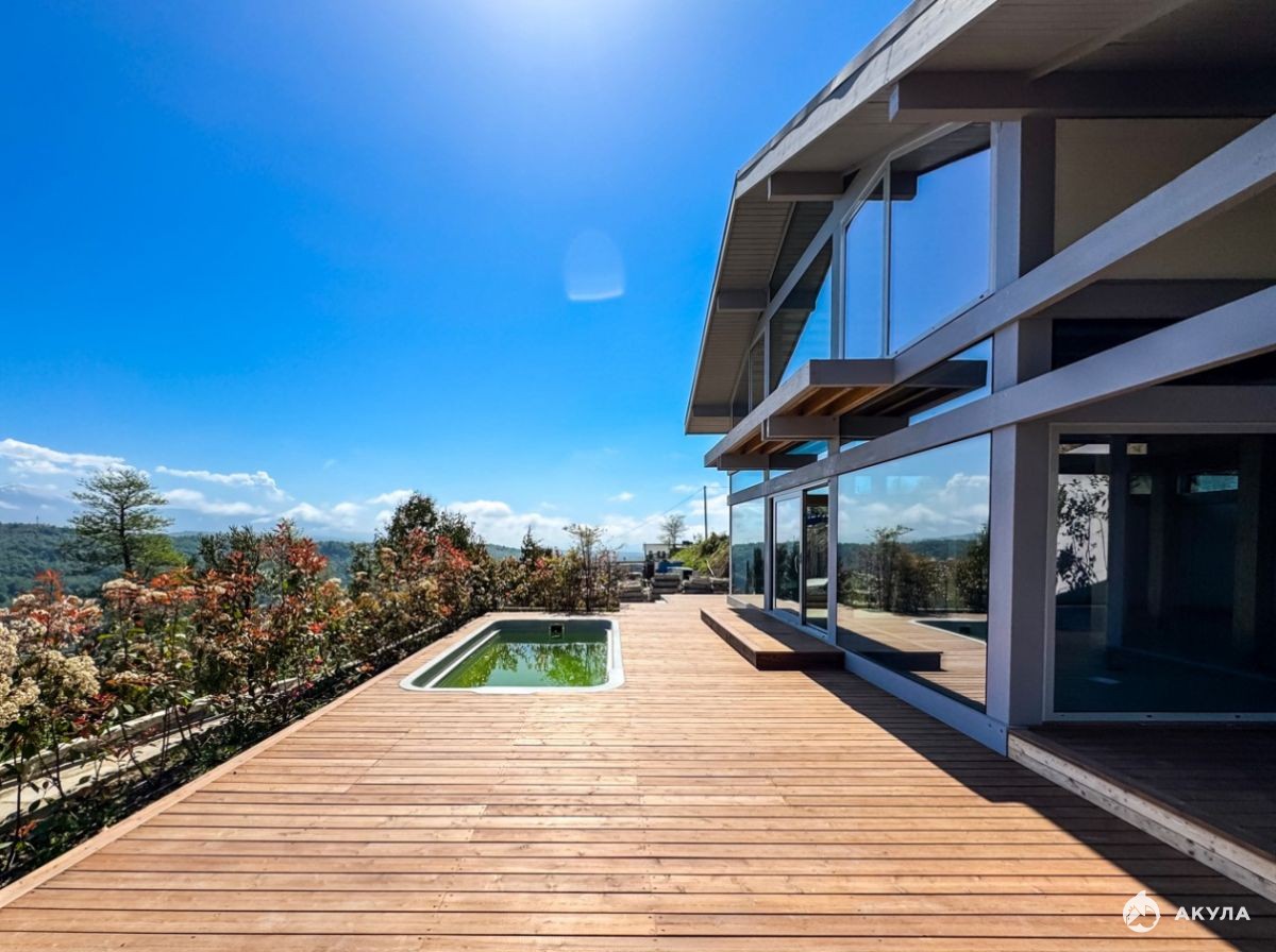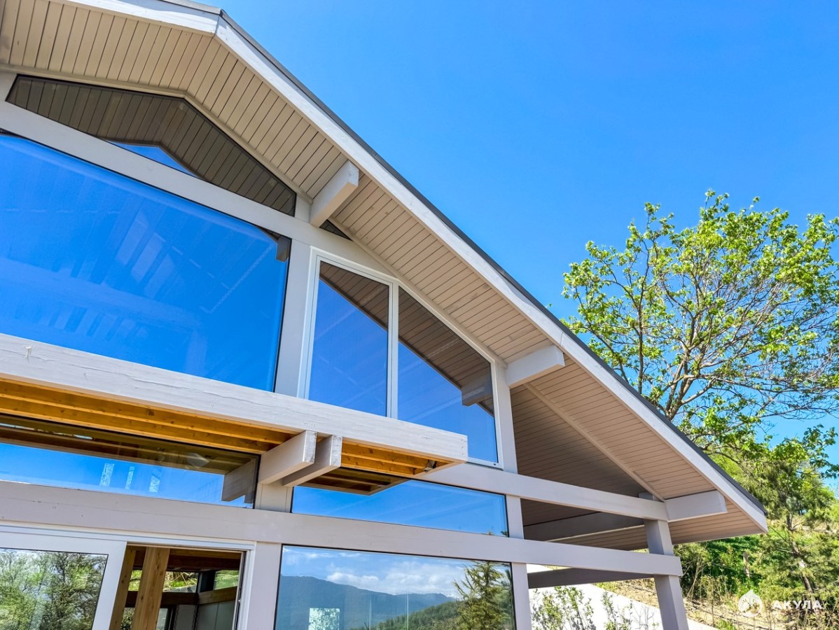 Дом построен по технологии фахверк. Фахверковое строение представляет собой конструкцию, в основе которой — жесткий каркас из бруса. Для панорамного остекления фахверковых домов используется специальные стеклопакеты, двухкамерные, ударопрочные, энергоэффективные, стекло компании Guardian — это вклеиваемые стеклопакеты беспрофильные (вклеиваются в каркас фахверка), устанавливаемые в прочный клееный брус. Это позволяет обеспечить прочность дому и сохраняет в нём тепло.