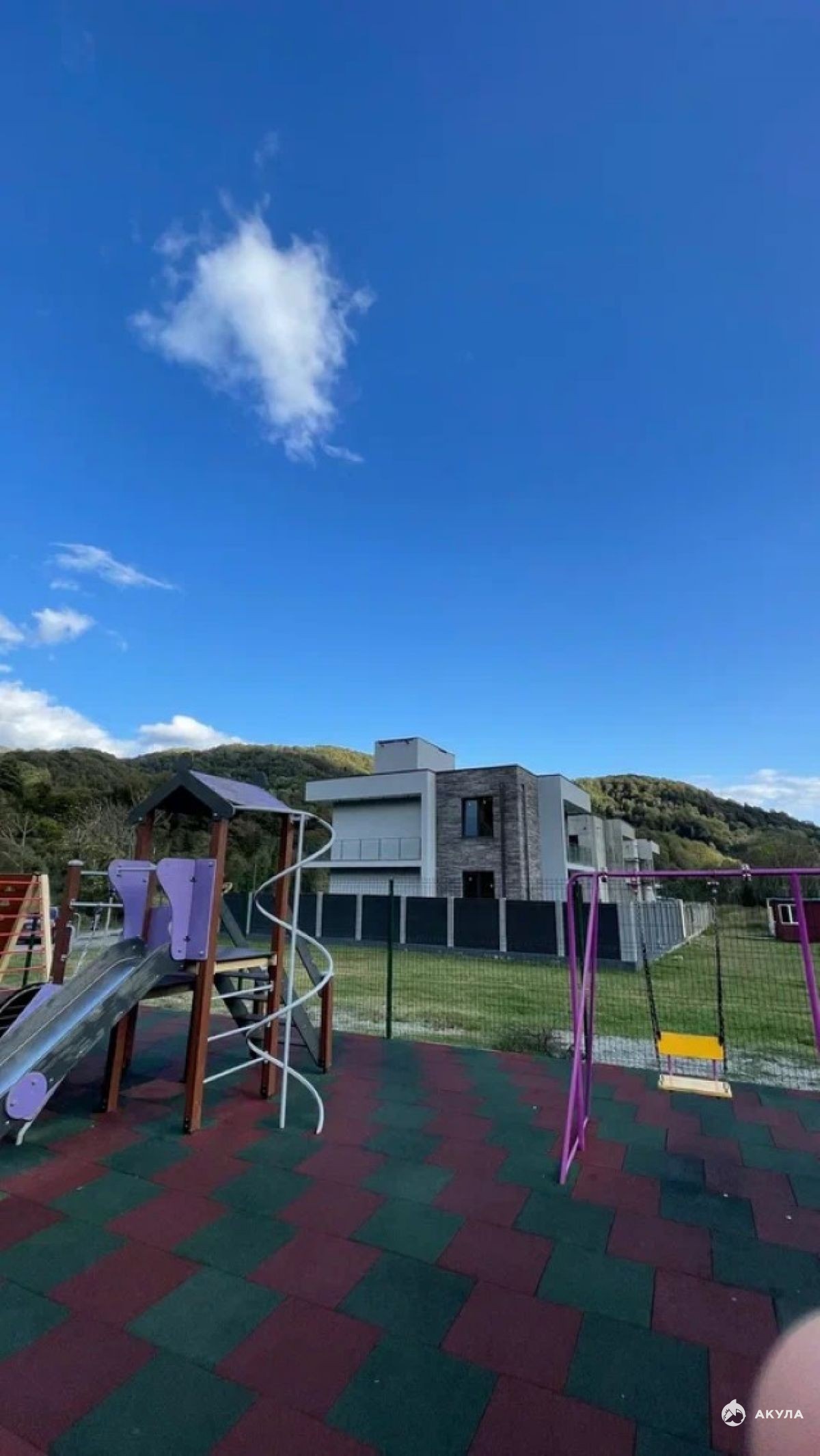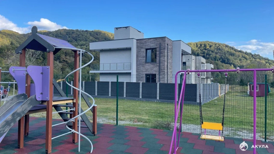 Отличный подъезд к домам по асфальтированной дороге, рядом новая детская площадка, 50 метров до горной реки.