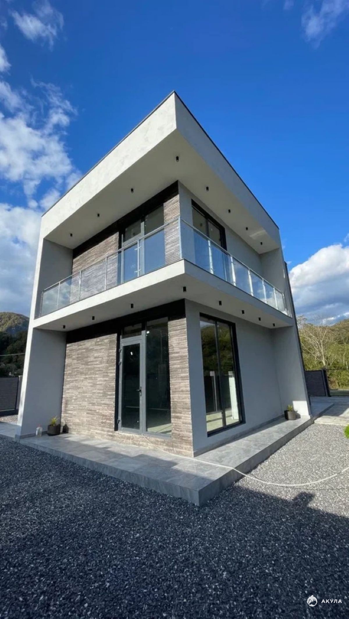 Всего 4 коттеджа в стиле хайтек. Площадь дома 200 м2, свободная планировка на 2-х этажах, плюс эксплуатируемая кровля. Коммуникации: вода — скважина, электричество 15 Квт, канализация — ЛОС, магистральный газ. Алюминиевые окна, комбинированная отделка фасадов — штукатурка и натуральный камень.
