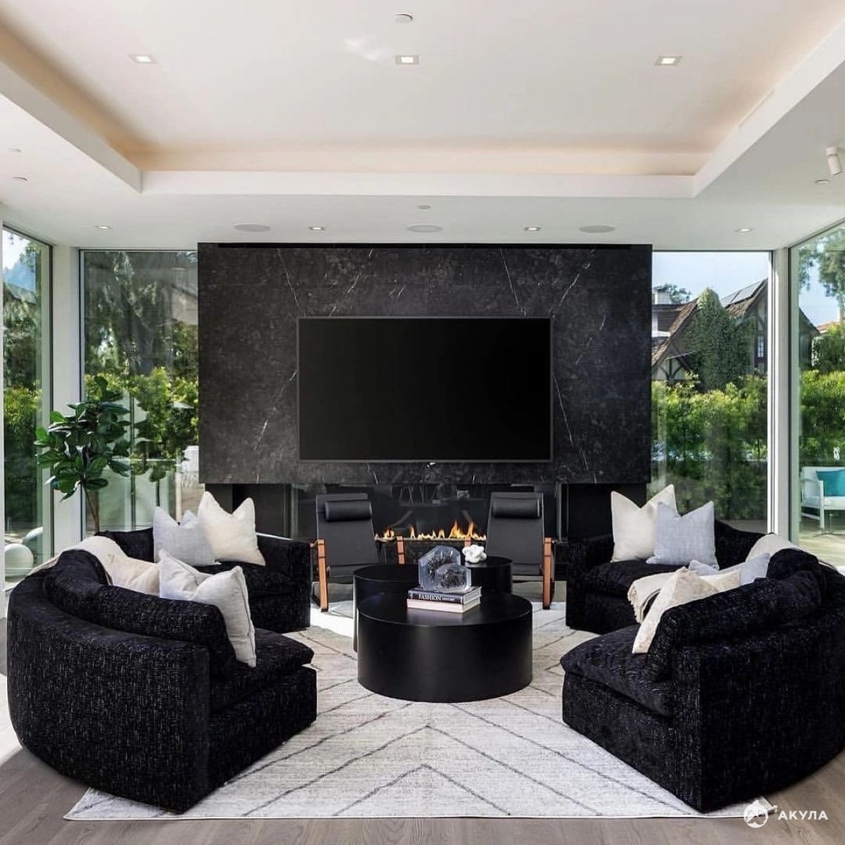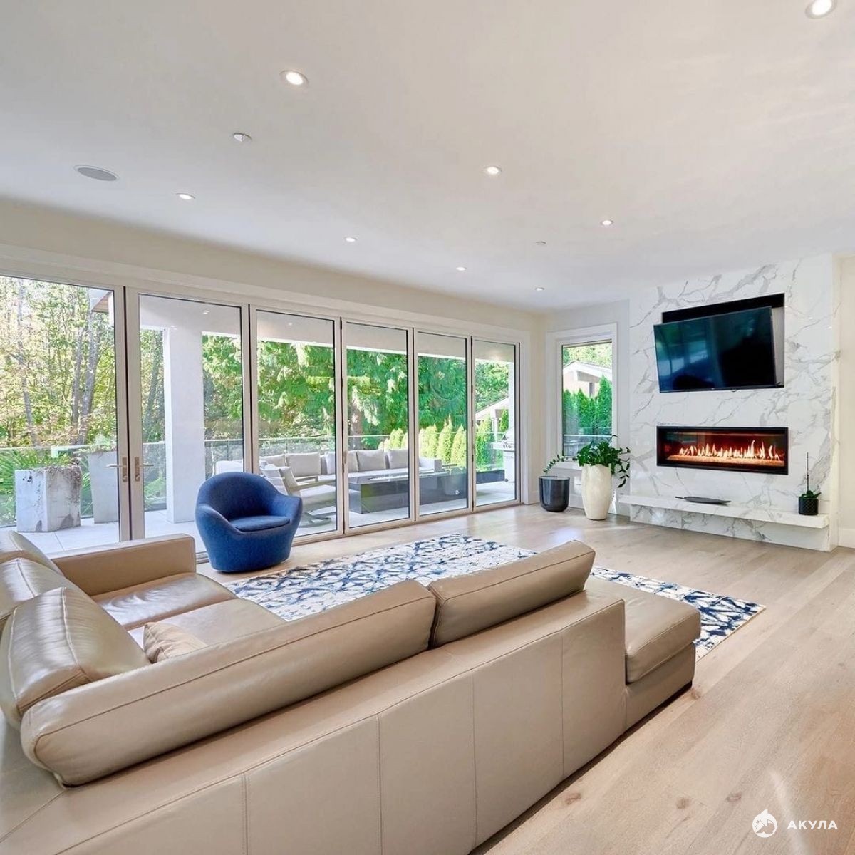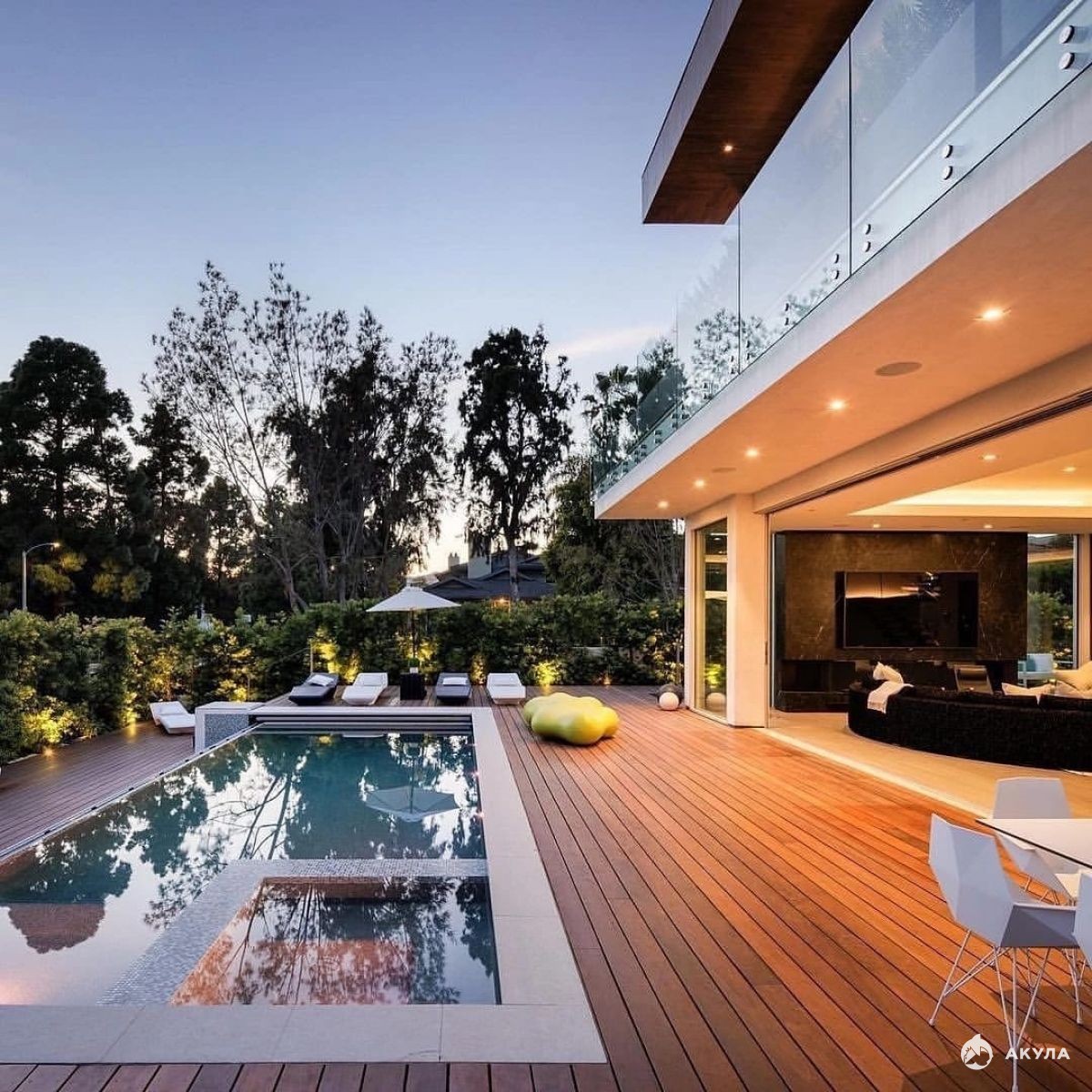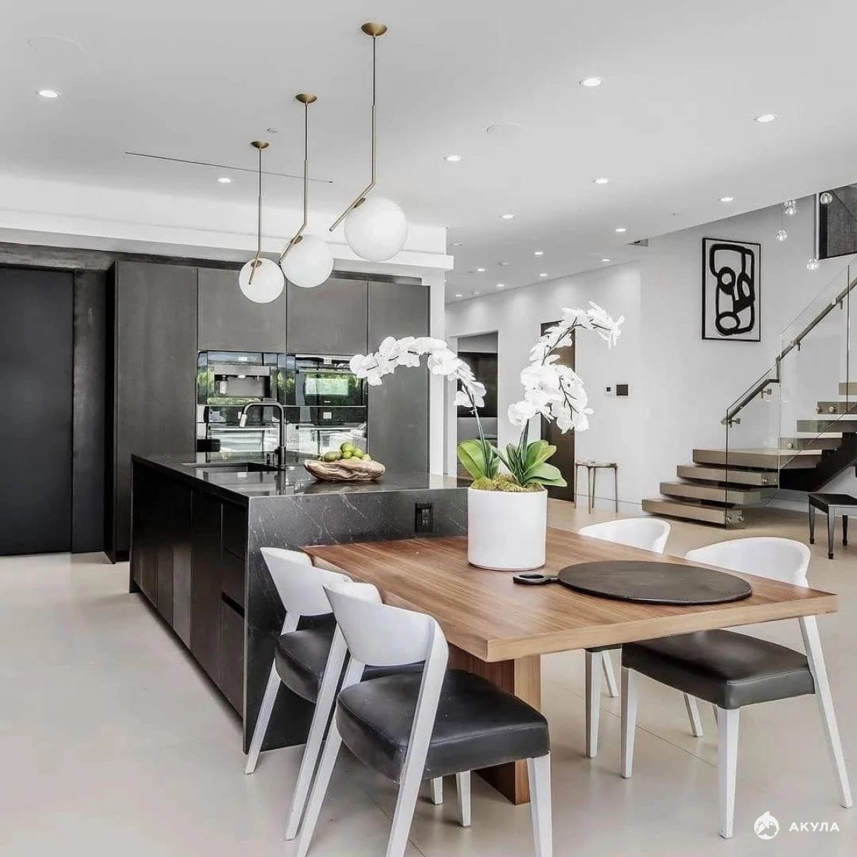 -просторная гостиная и кухонная зона с выходом на террасу к бассейну