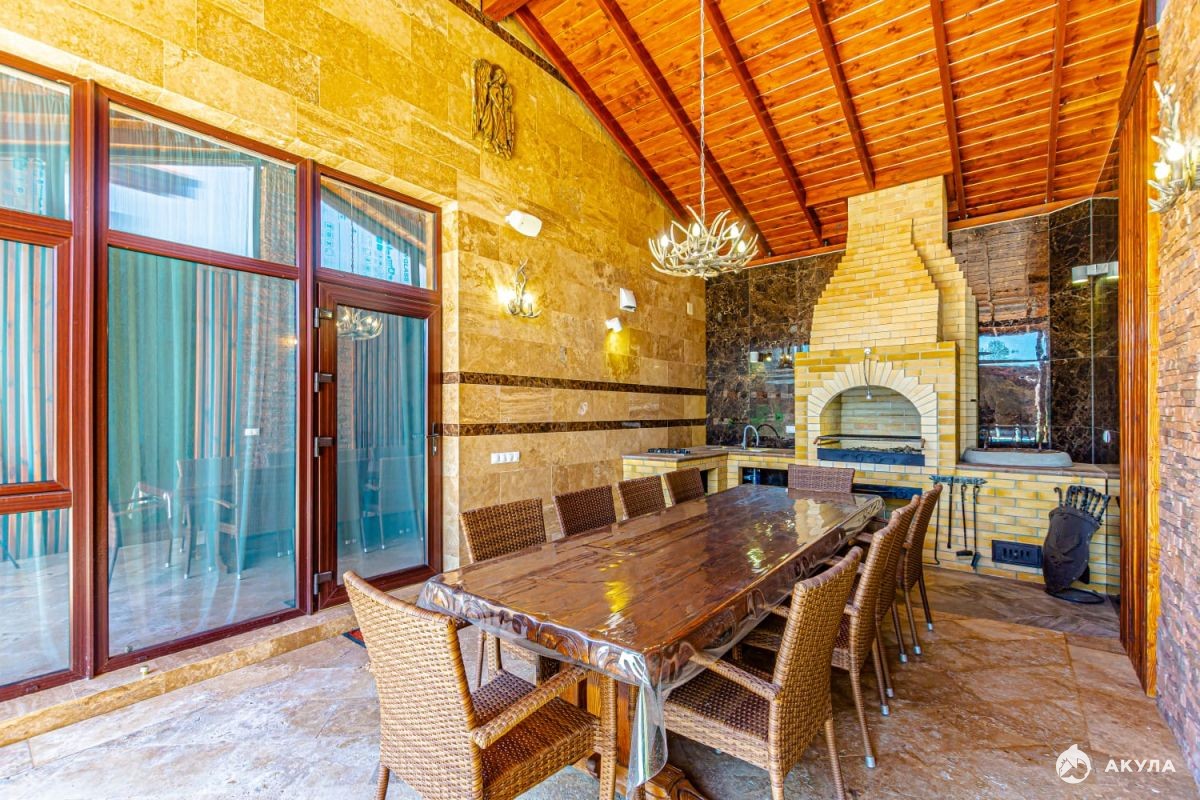 Основной дом облицован натуральным камнем "травертин", монолитный каркас с заполнением керамзитобетонными блоками и утеплителем, толщина стен 40 см.