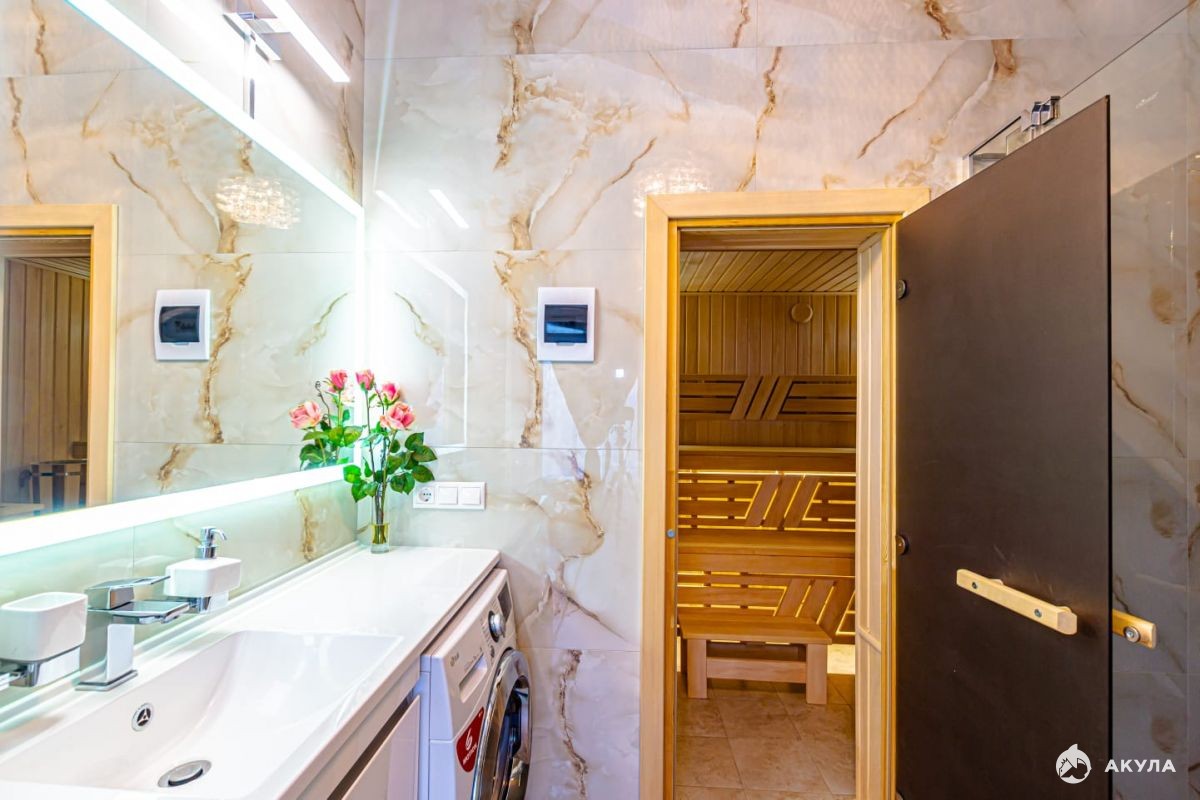 На 1-ом этаже: просторный зал с камином, со вторым светом, высота потолков 6-7 метров, кухня-столовая, кабинет, гостевой санузел, постирочная. На 2-ом этаже: мастер спальня со своим санузлом и гардеробной, детская спальня со своим санузлом и гардеробной. На 3-ем этаже: лаунж зона свободной планировки (спортзал, домашний кинотеатр, спальня), санузел.