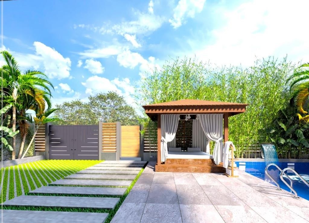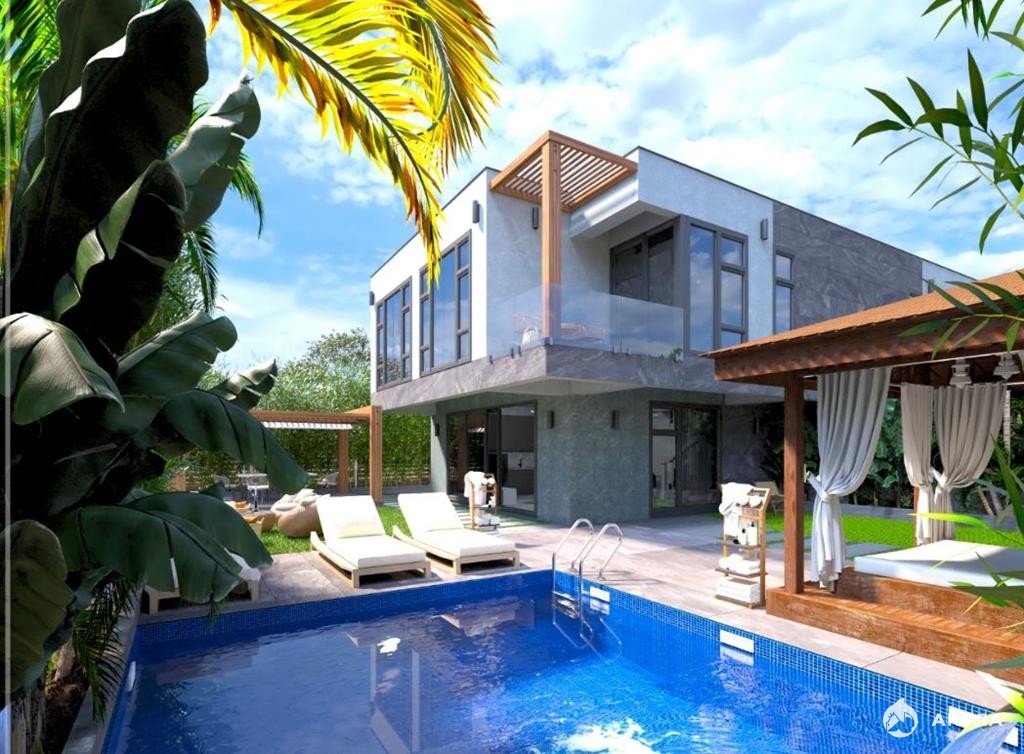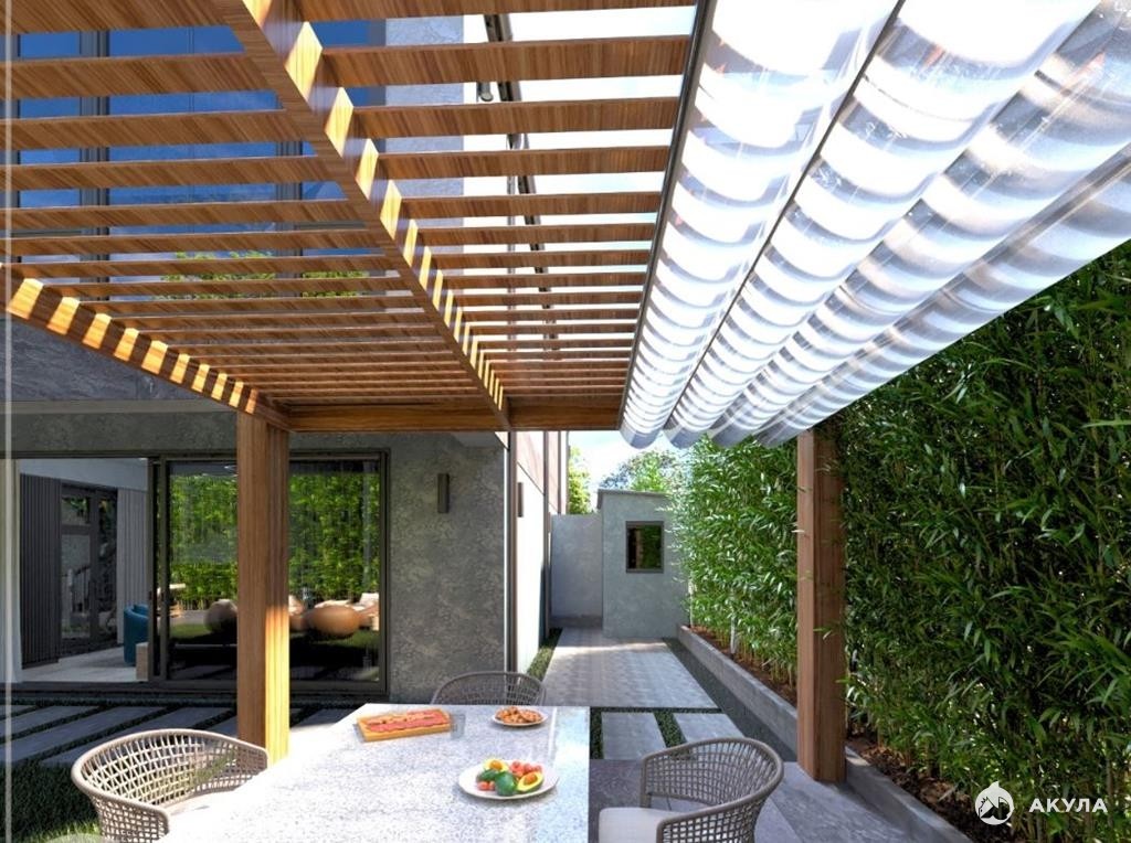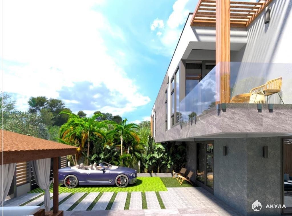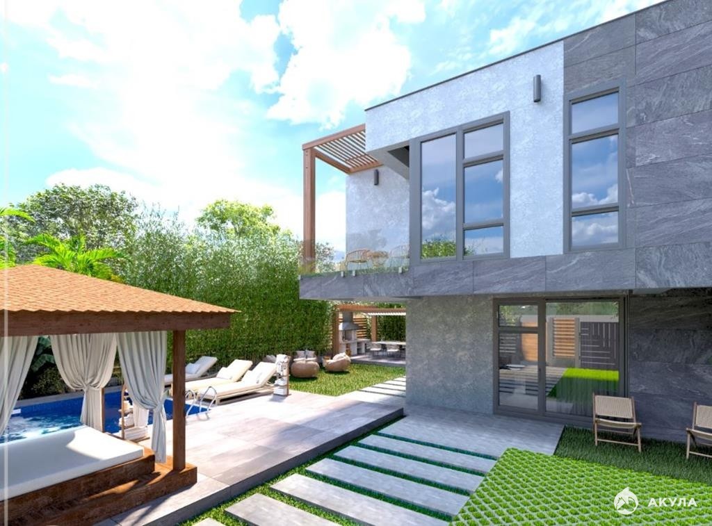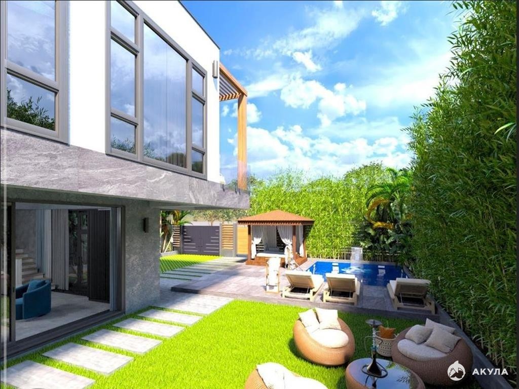 На придомовой территории уникальное дизайнерское решение по ландшафту, лаундж зоне и зоне отдыха. Установлен бассейн с подогревом.