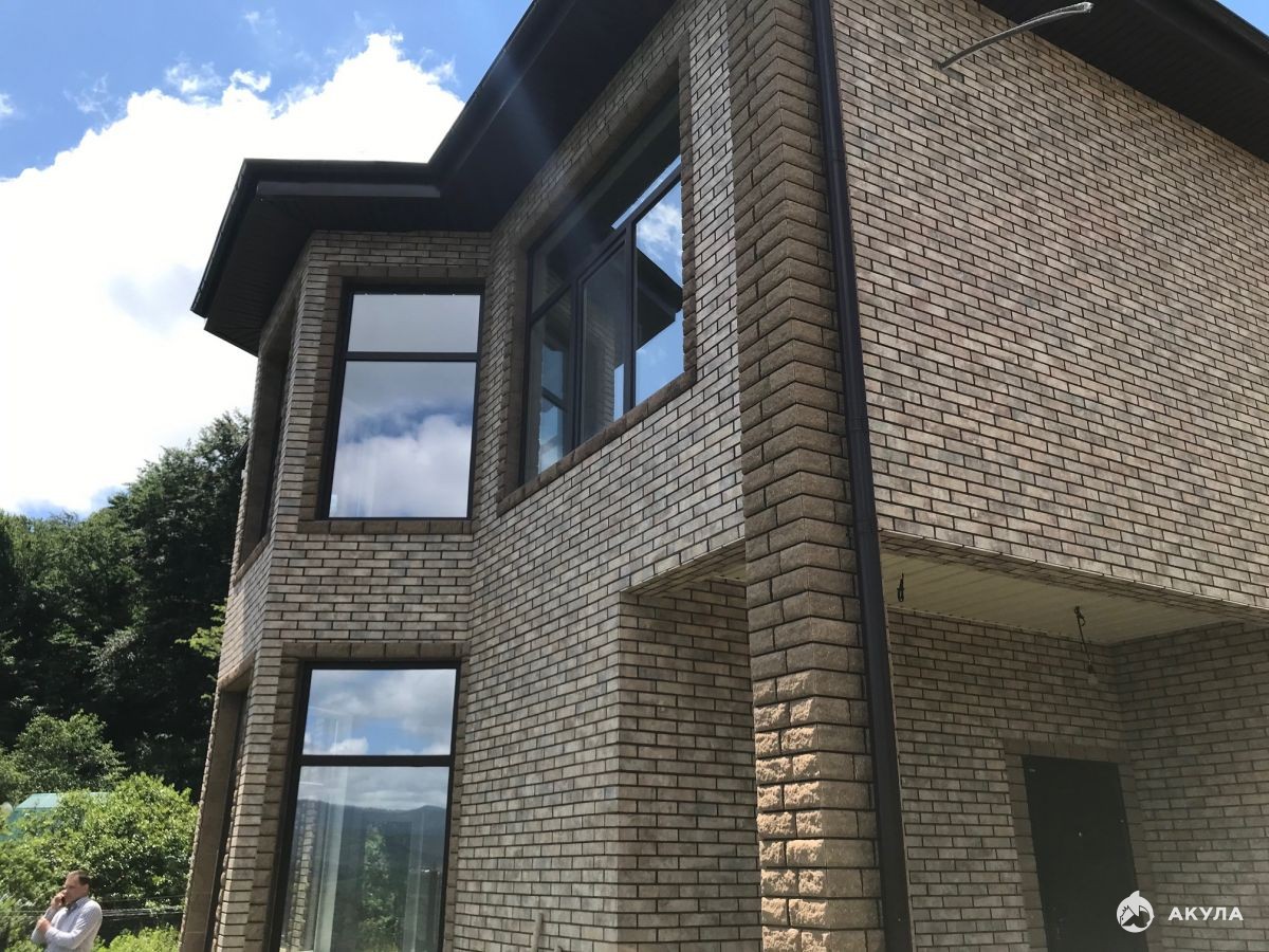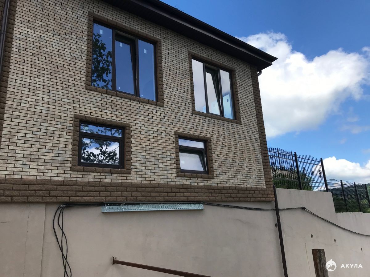 Кровля - мягкая черепица. Окна - REHAU, снаружи темный дуб, внутри - белые с энергосберегающим покрытием Solar.