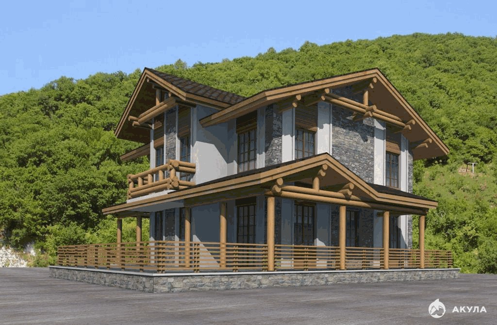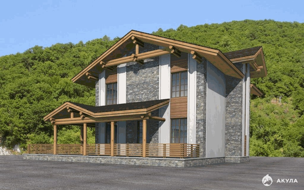 Коттедж в 2 этажа. Отделка: натуральный камень и дерево. Окна алюминиевые. Декоративная штукатурка. Планировка коттеджа свободная, отделка черновая.