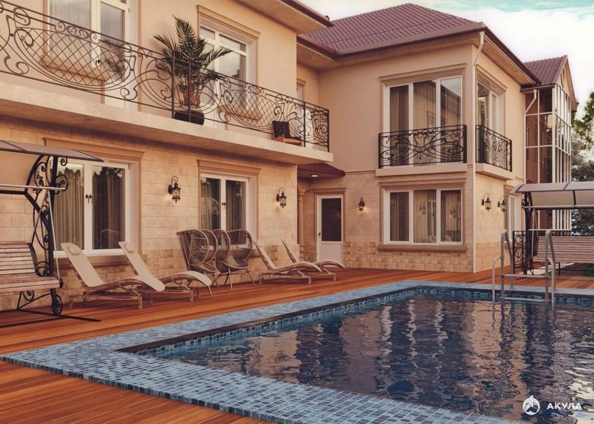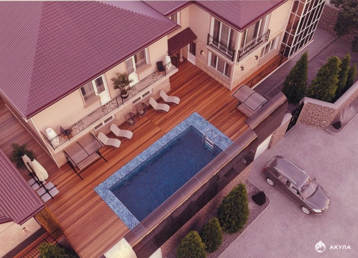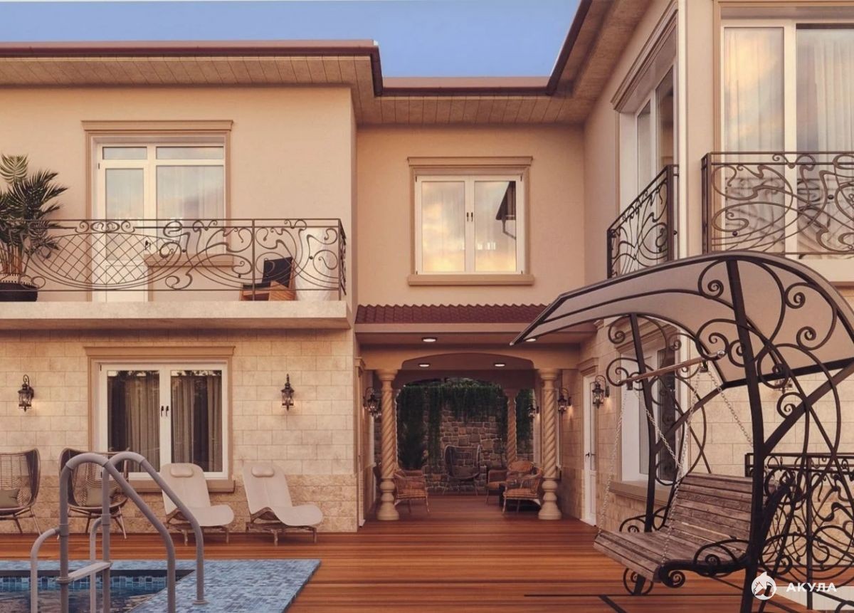 Площадь участка – 9 соток. Кроме красивого ландшафтного дизайна, территория отличается наличием собственного фруктового сада, где растут хурма, инжир, деревья оливы. Есть бассейн, площадь которого составляет 89 м2, спортивная площадка и летняя кухня.