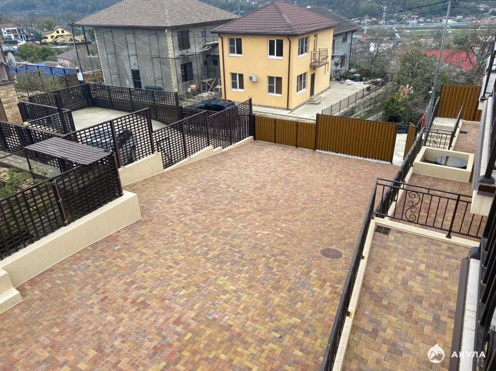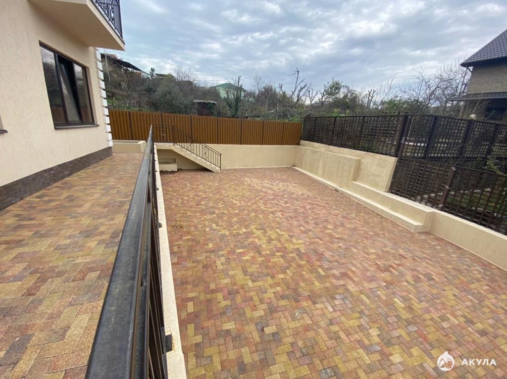 Придомовая территория полностью облагорожена - вымощена камнем, озеленена, также установлены лестницы и опорные стены.