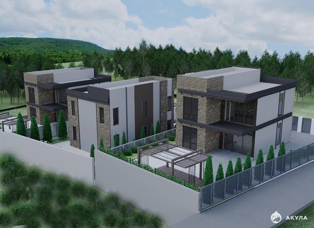 Коттедж имеет 2 этажа свободной планировки 170 м2 общей площади + эксплуатируемую крышу 70 м2. Общая площадь по выписке 240 м2. На каждый дом 4 сотки земли. ИЖС, земля в собственности. Номер объекта: #5/600718/11901