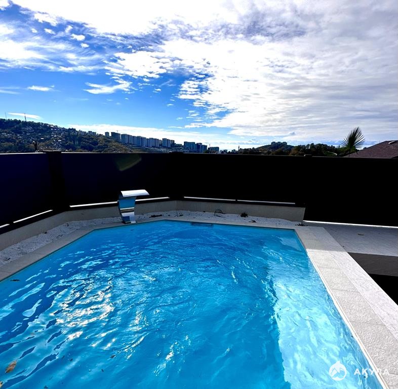 Бассейн у дома ПОДОГРЕВАЕМЫЙ с ПРОТИВОТОКОМ И ХРОМОТЕРАПИЕЙ. Гараж на 2 авто. Ландшафтное озеленение. Террасы. Панорамные виды.