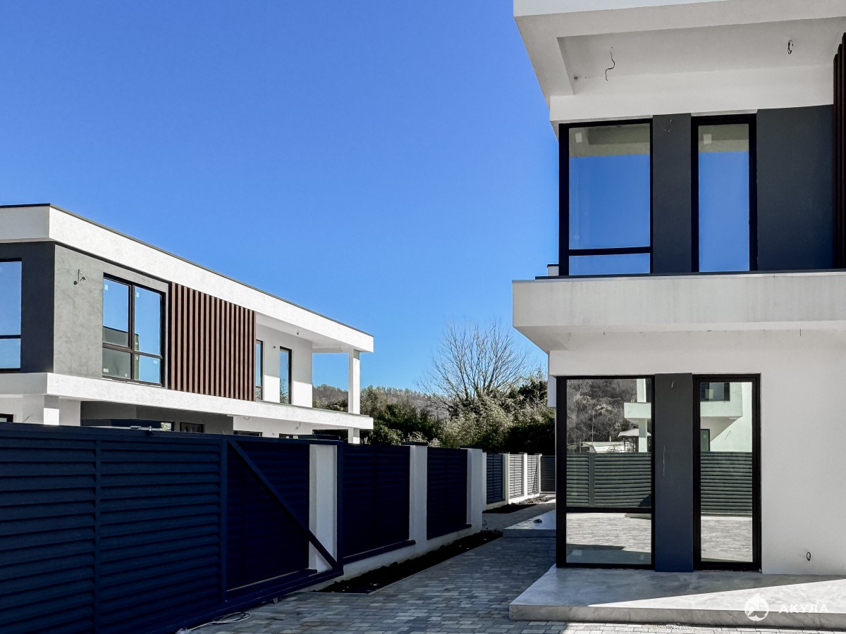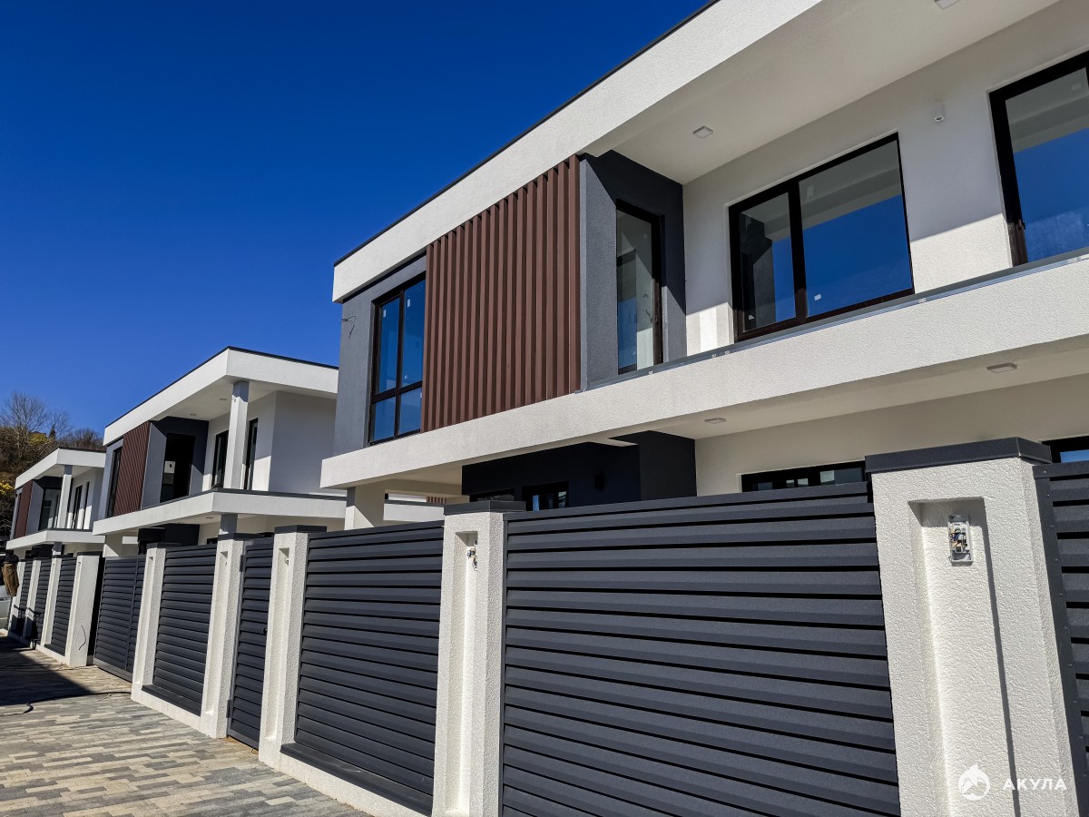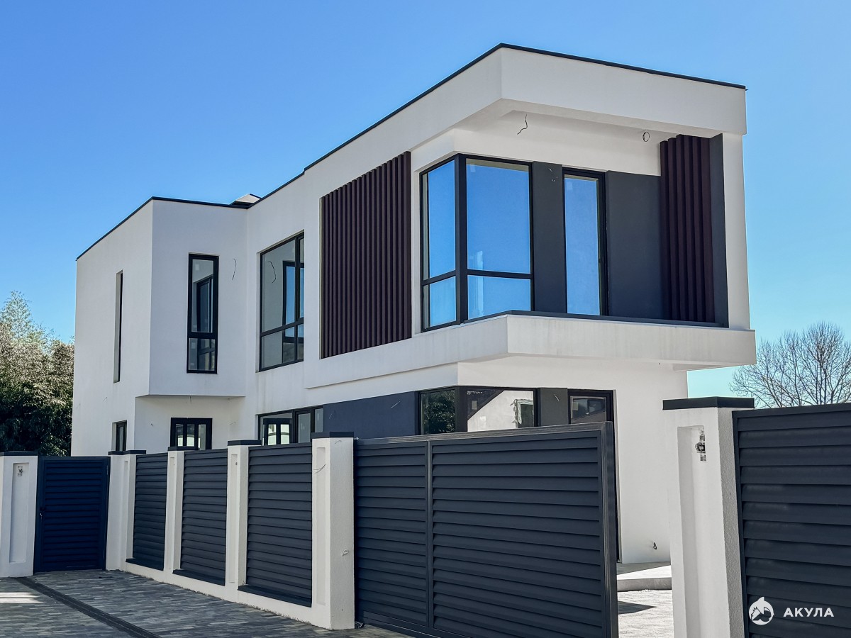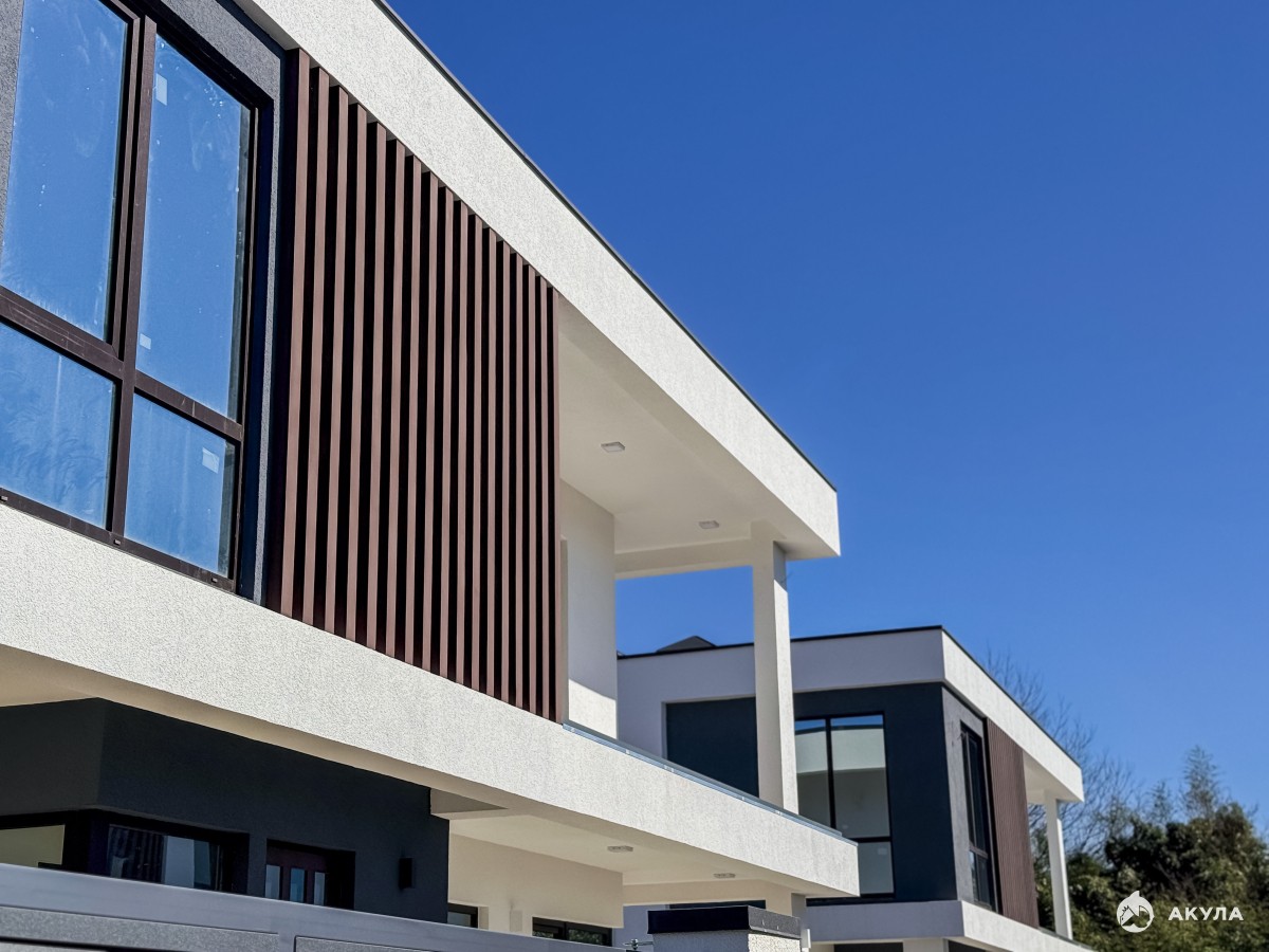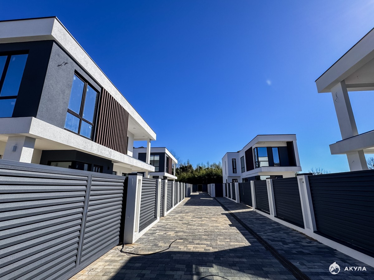 Архитектура домов современная, стиль хай-тек. Прямоугольные ровные формы, панорамное остекление - органично вписывают дома в окружающий ландшафт. Инженерия выполнена по всем современным требованиям – центральные коммуникации проложены под землей, канализация ЛОС.