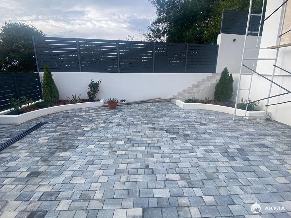 Двор обложен керамогранитом, а фасад оформлен в комбинации короеда и натурального травертина, при этом крыша также выполнена из керамогранита.
