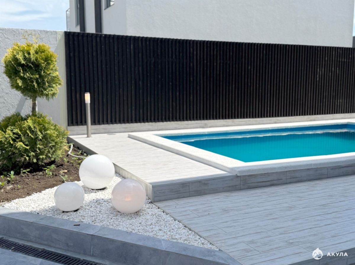 Отличительной особенностью посёлка является продуманная до мелочей территория, правильно спланированный ландшафт. У дома свой залитый круглогодично подогреваемый бассейн, зона патио, беседка в стиле дома, высажены круглогодичные растения. Въезд на территорию дома через автоматические ворота. Декоративное освещение и подсветка домов и ландшафта создают чувство уюта в любое время суток.