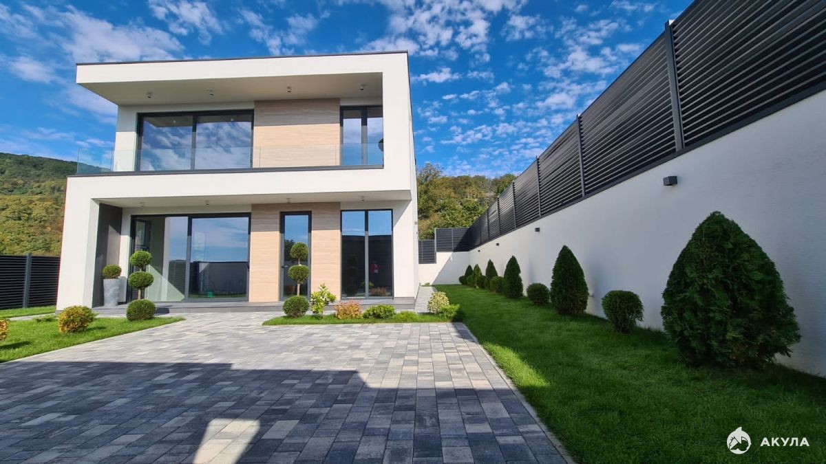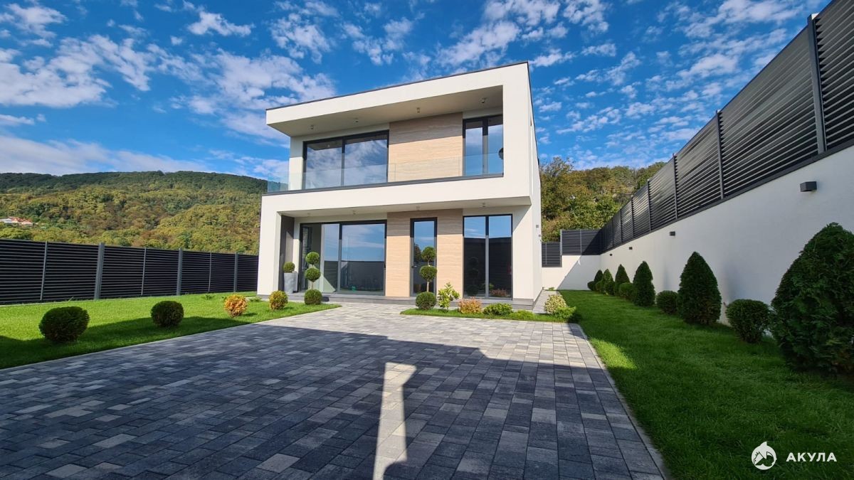 Выполнена качественная отделка фасада. Из панорамных окон открывается шикарный вид на горы.