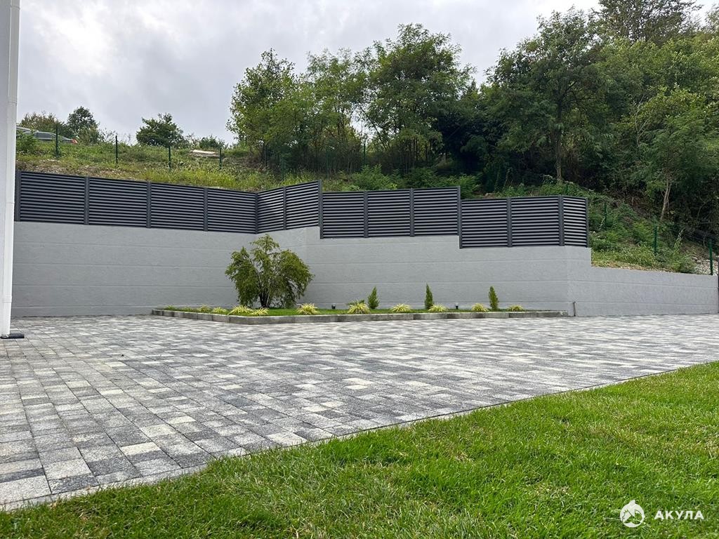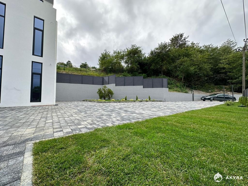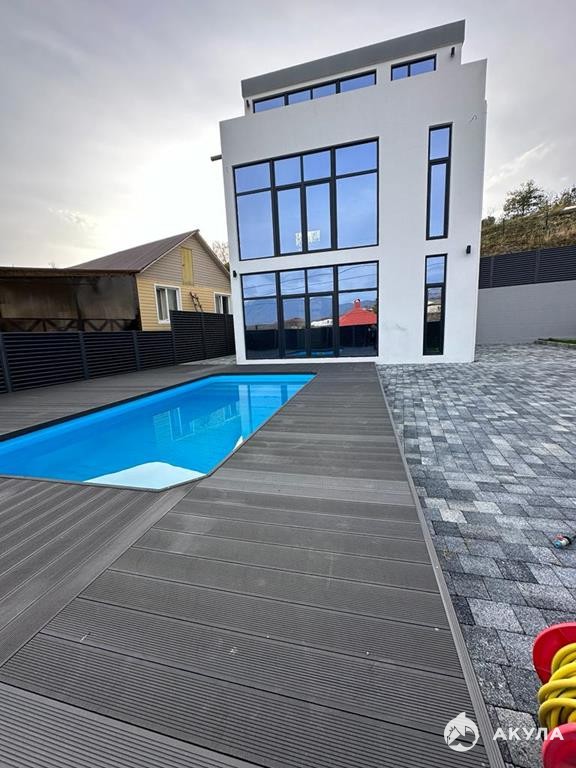 Придомовая территория облагорожена, ландшафтное озеленение, есть бассейн. Просторная парковка.