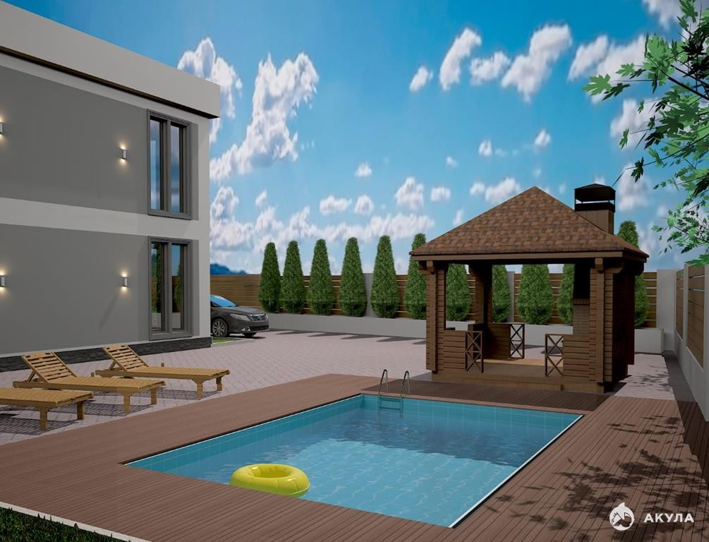 На территории выполнен ландшафтный дизайн, выложены прогулочные дорожки, установлен бассейн и детская игровая площадка.
