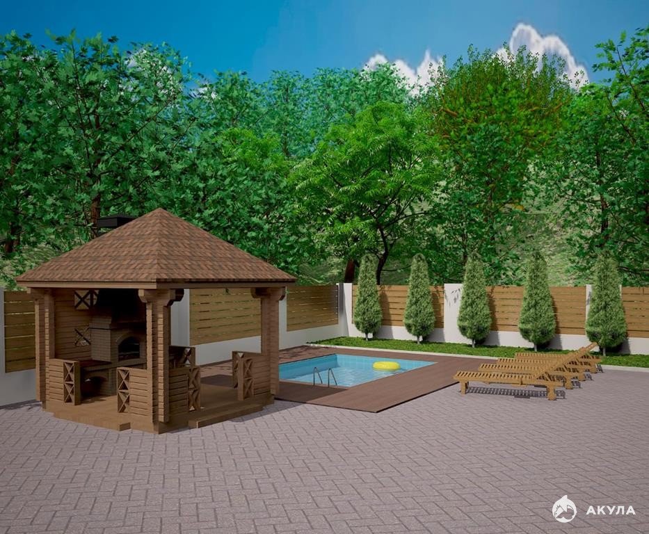 На территории КП выполнен ландшафтный дизайн, проведено освещение, установлен бассейн, детская игровая площадка, а так же определены зоны отдыха и барбекю.