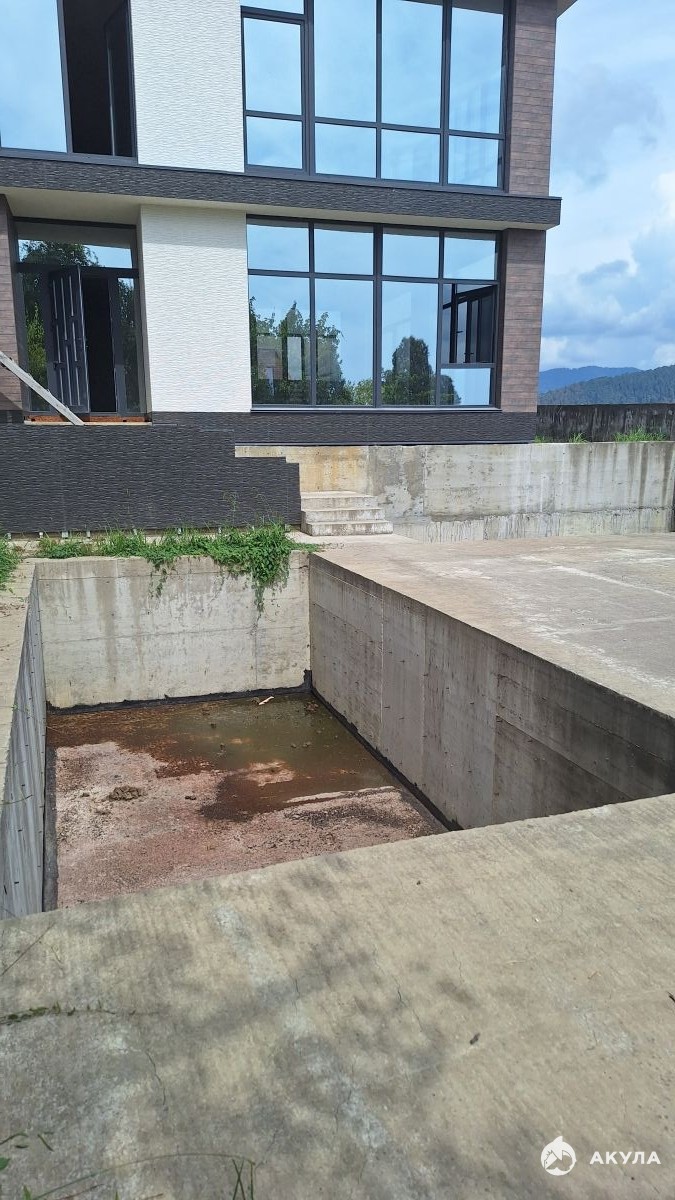На территории построен монолитный паркинг с электрическими воротами , на два машиноместа , из бетона вылита чаша под бассейн на монолитных сваях и зона барбекю .