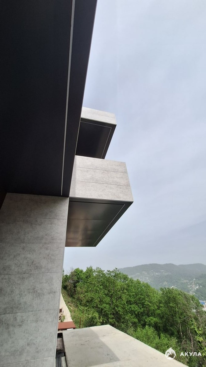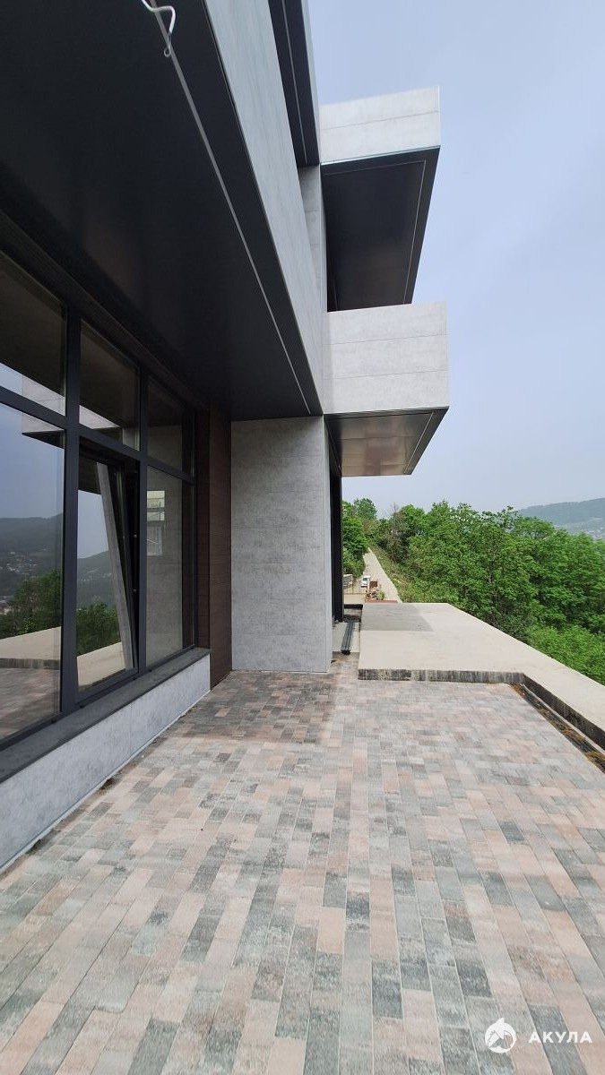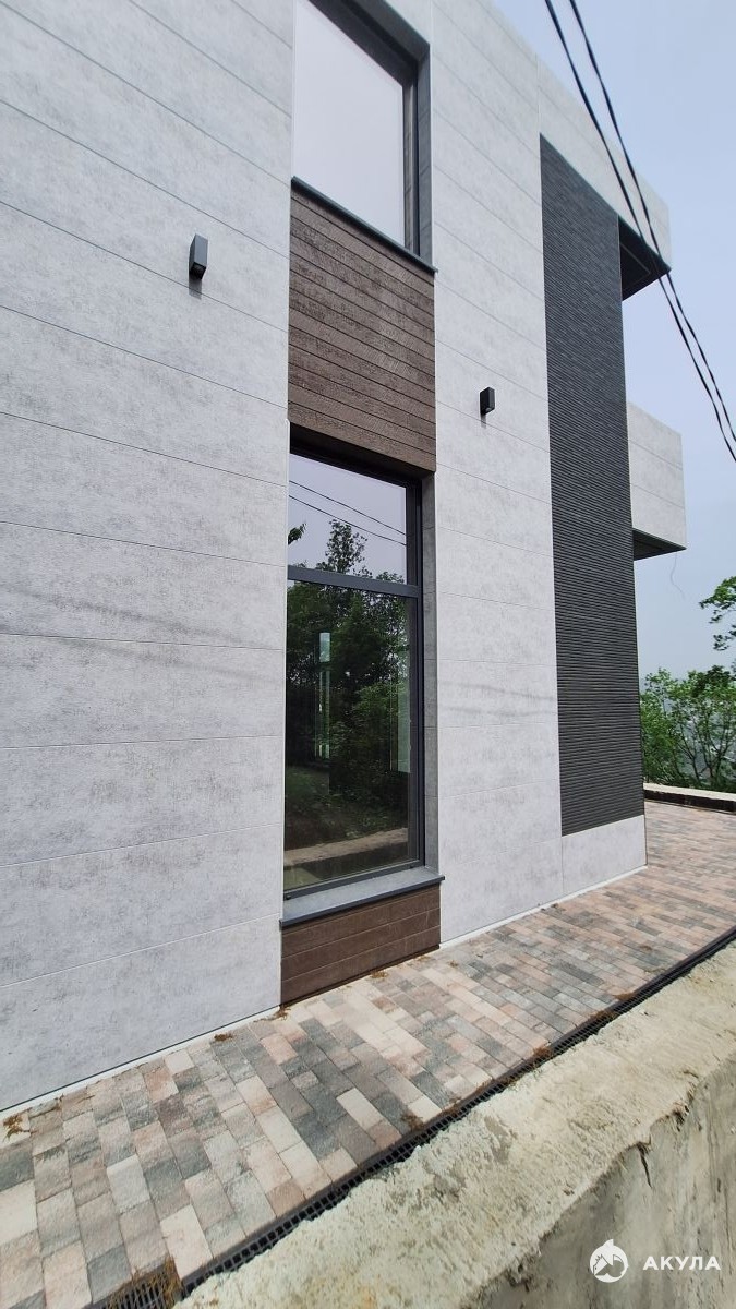 Коттедж построен на монолитном фундаменте, используя инновационные японские фиброцементные панели "Кемью", которые обеспечивают долговечность и устойчивость к влажности. Алюминиевые окна "ALUTECH" с двойной гидроизоляцией гарантируют комфорт и безопасность жильцов в любую погоду.