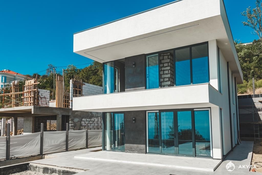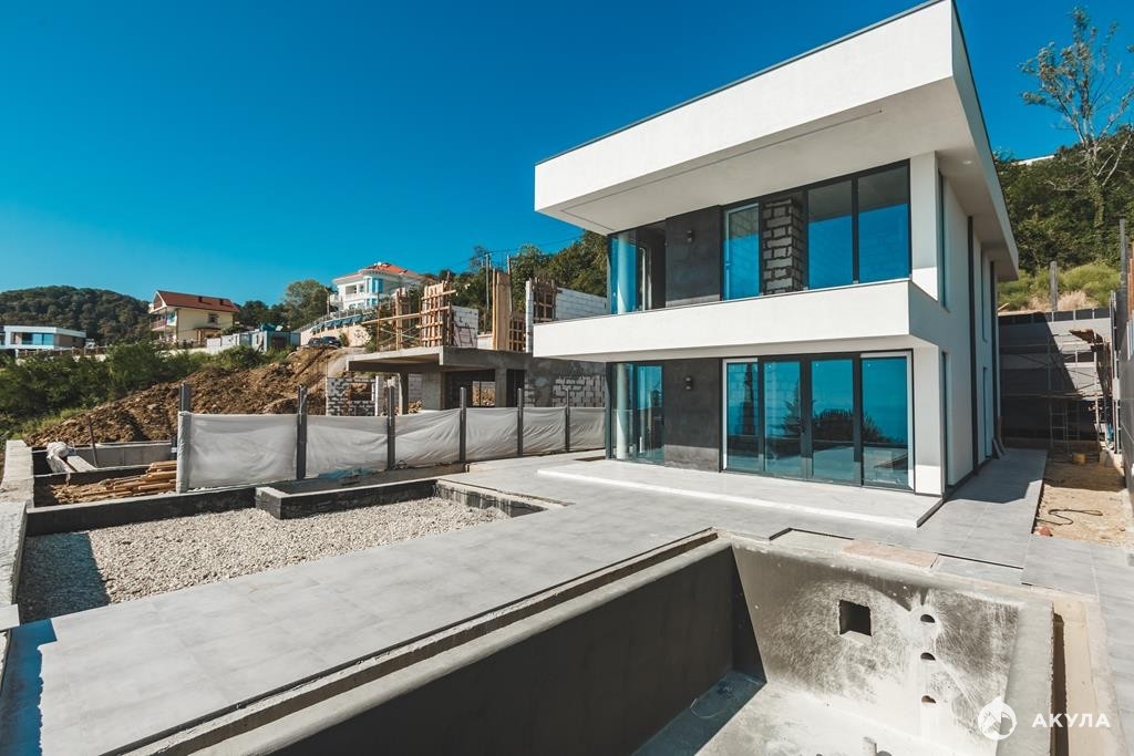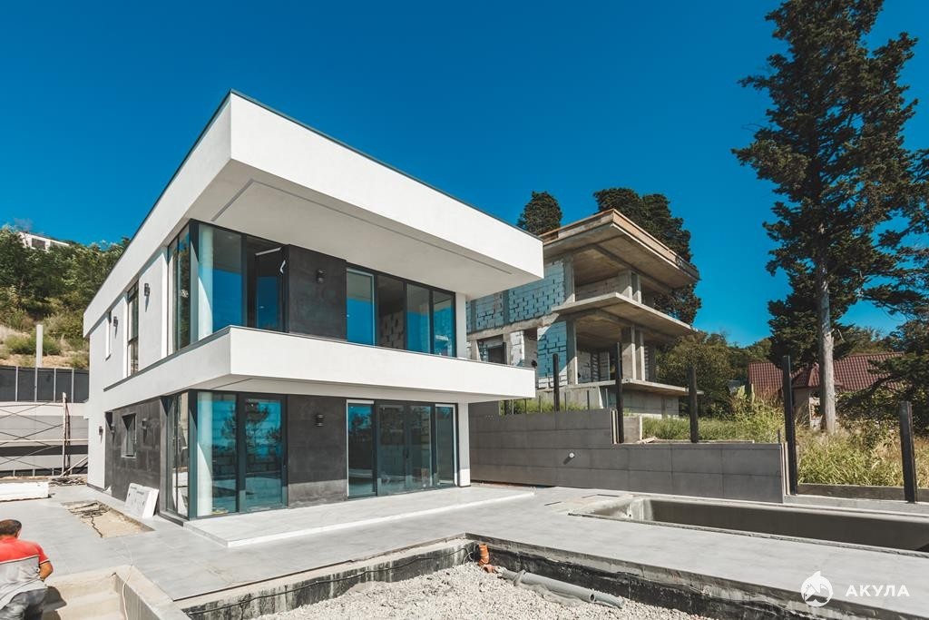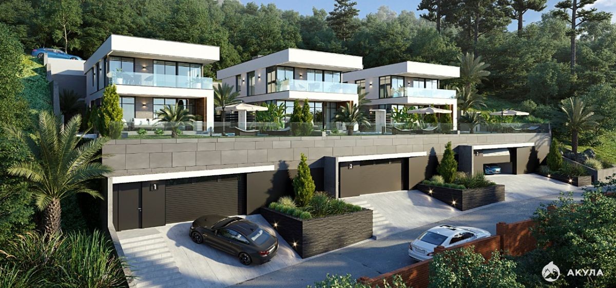 Планировка дома: 1 этаж — просторная кухня-гостиная с выходом на террасу и к бассейну, гардеробная, санузел. 2 этаж — три спальни, в каждой с выходом на индивидуальную террасу, санузел.