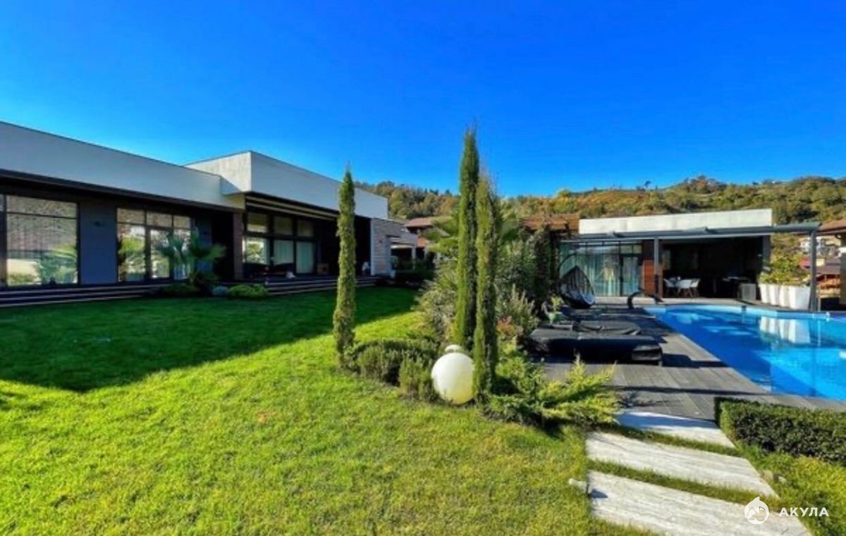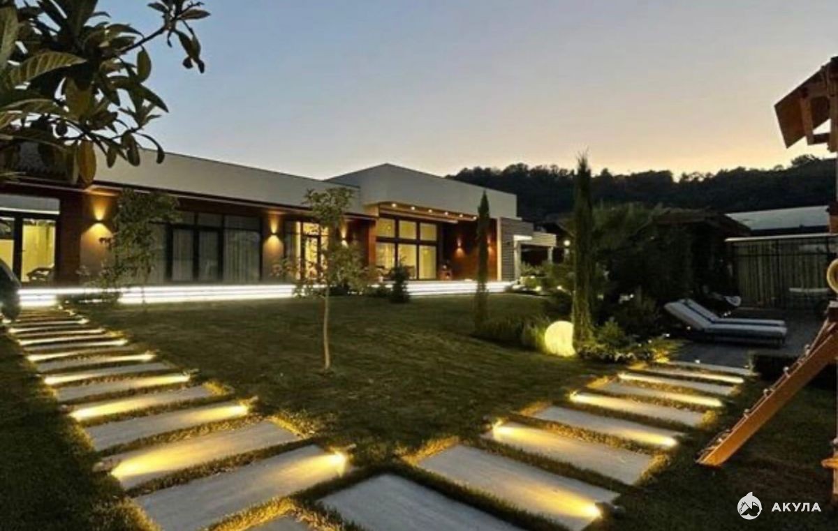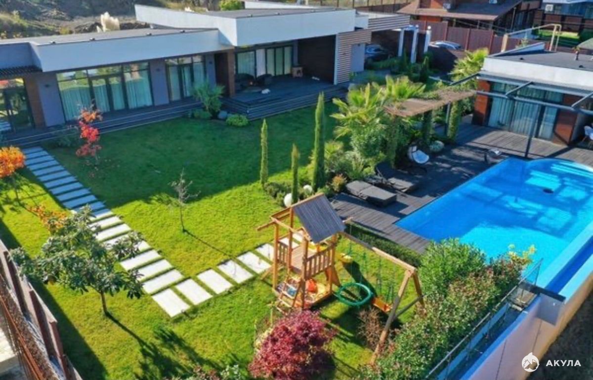 На территории высажены ели, туи, яблони и инжир, разные сорта винограда, газон. Установлен автополив. За домом полисадник с ягодами и плодовыми деревьями. На территории расположен круглогодично подогреваемый бассейн и детская площадка. Установлена охранная система с датчиками движения, открытия, закрытия окон. Видеонаблюдение по всему периметру участка. Дом оснащён системой умный дом.