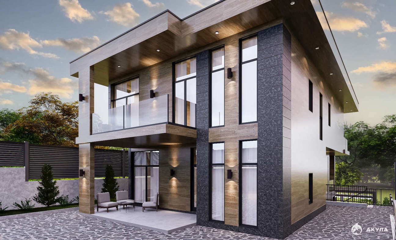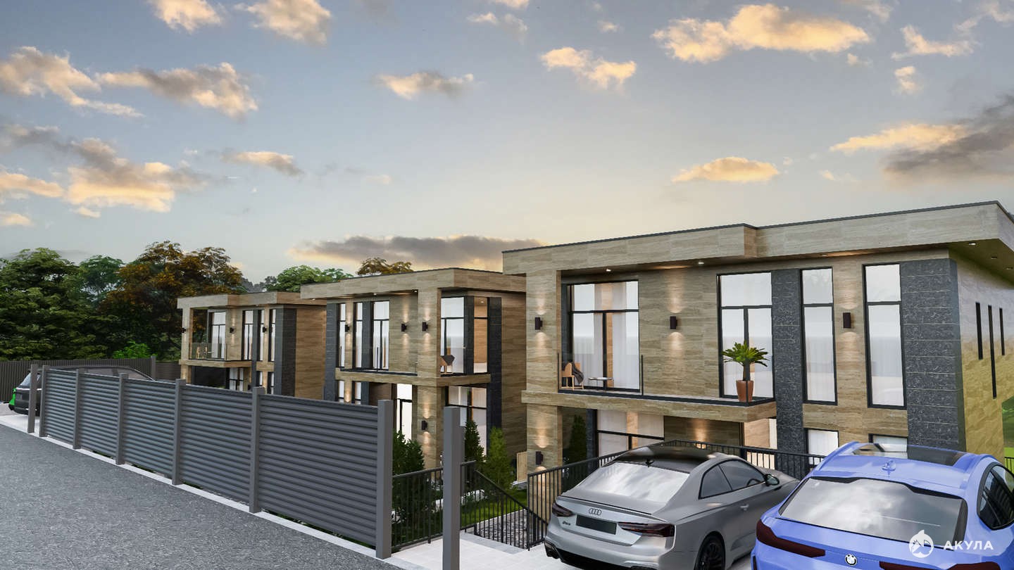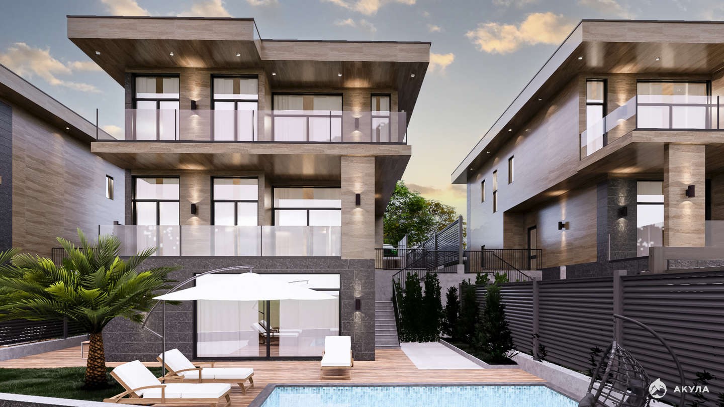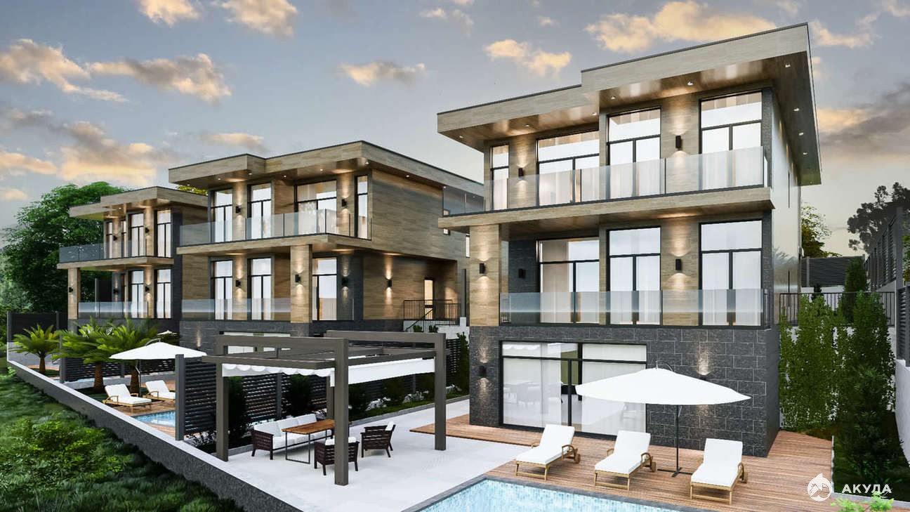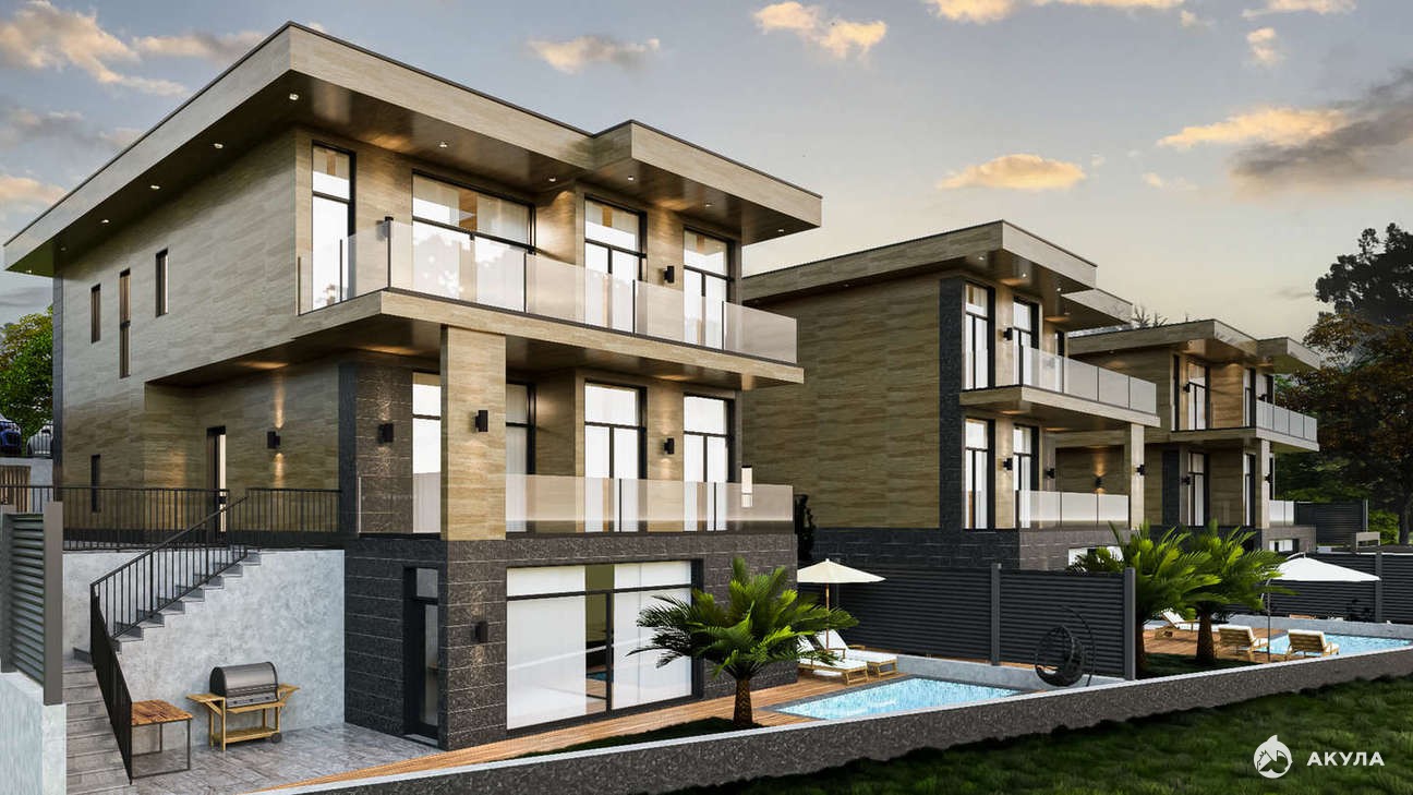 Вилла из трех этажей, монументальное строение. Высокие потолки, фасад из натурального травертина, панорамные окна.