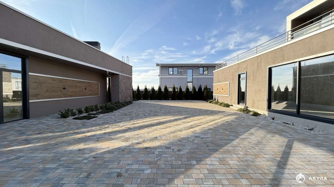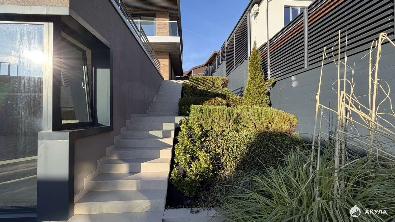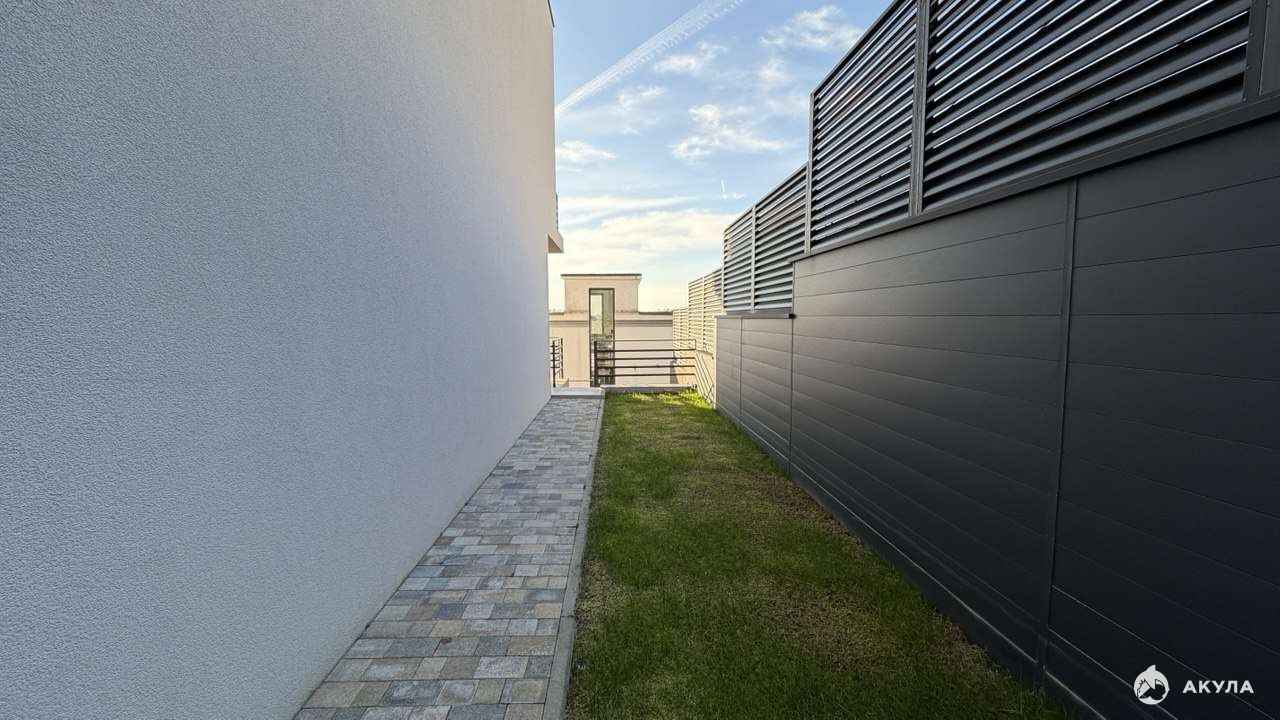 Развитая инфраструктура: рядом расположены другие современные дома, что создаёт атмосферу престижного коттеджного посёлка.