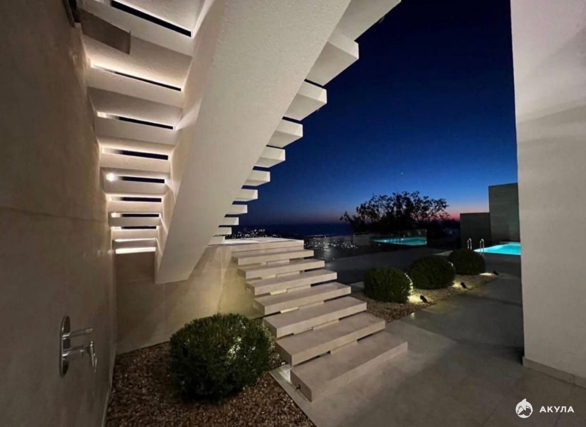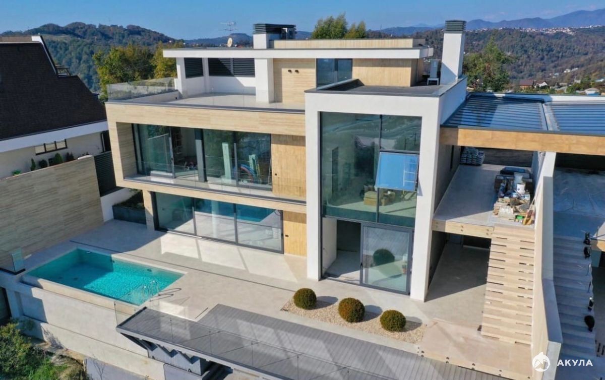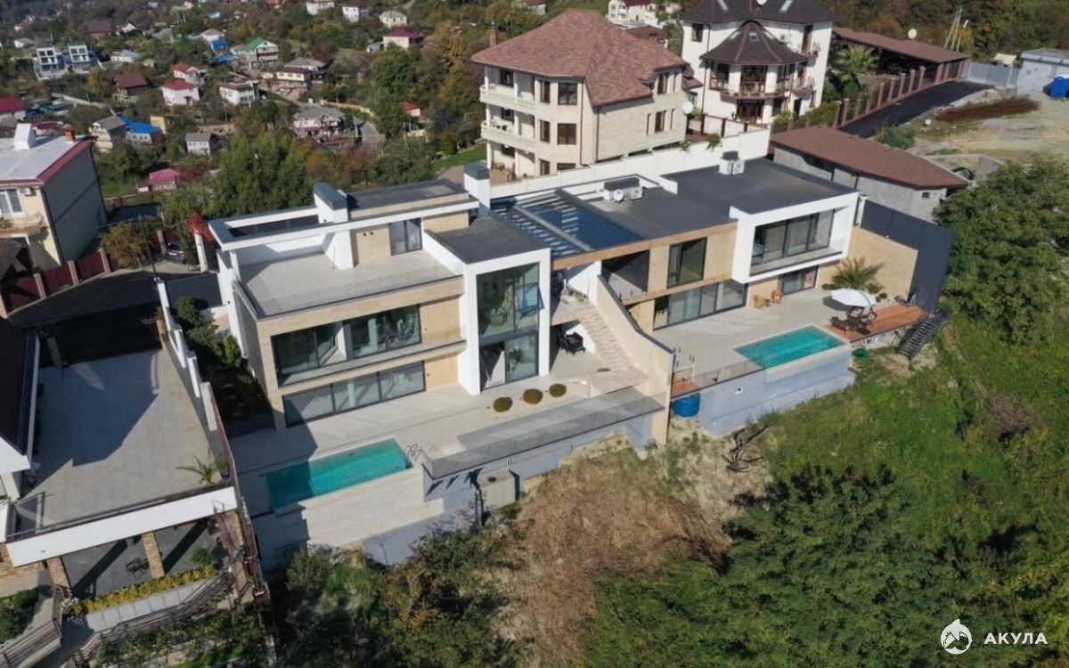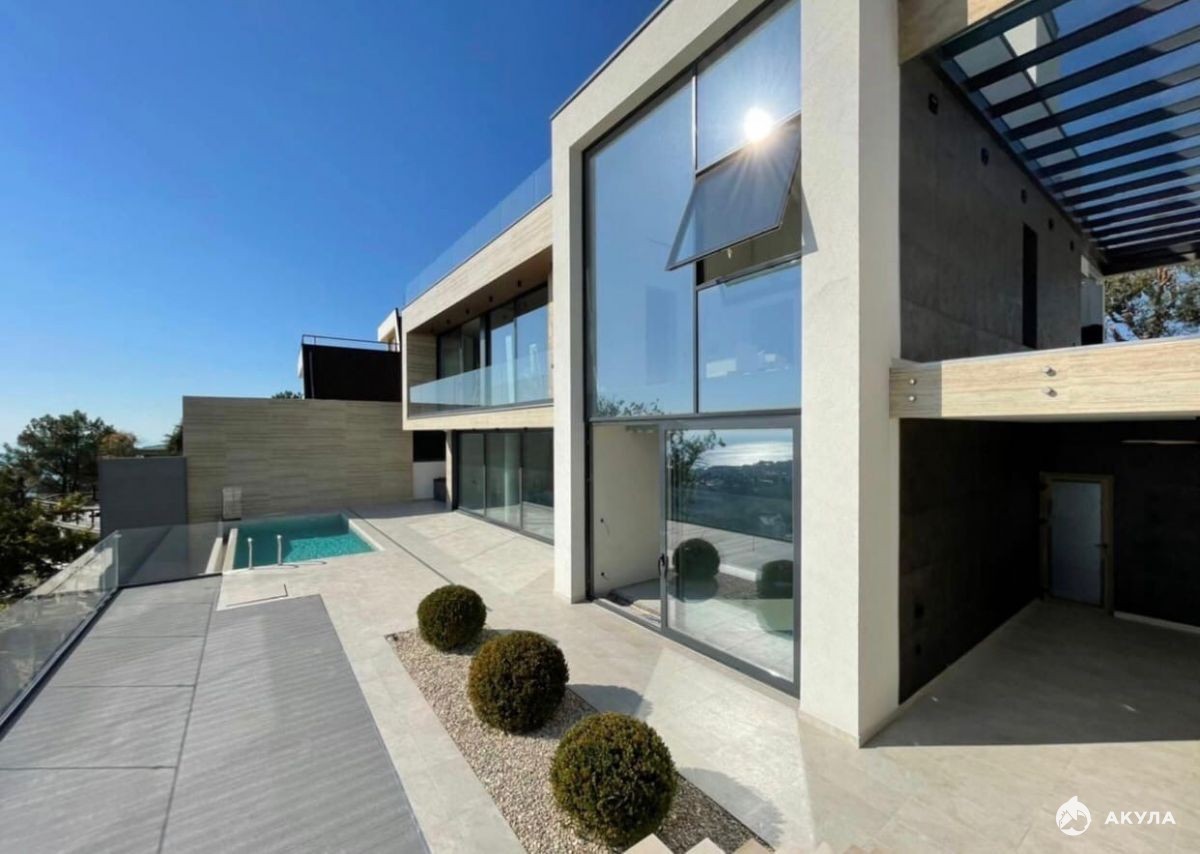 Плaниpовка и дизaйн дoмa объeдиняет внутpеннее и внешнее пространство. Из каждой комнаты открывается свой уникальный вид на море, город, горы. Фасад выполнен из натурального камня. с применением качественной штукатурки. Остекление - алюминиевый панорамный профиль. Усиленный фундамент. В доме расположились просторная кухня-гостиная, главная спальня с гардеробом и своим санузлом, детская, кабинет, гардеробная.