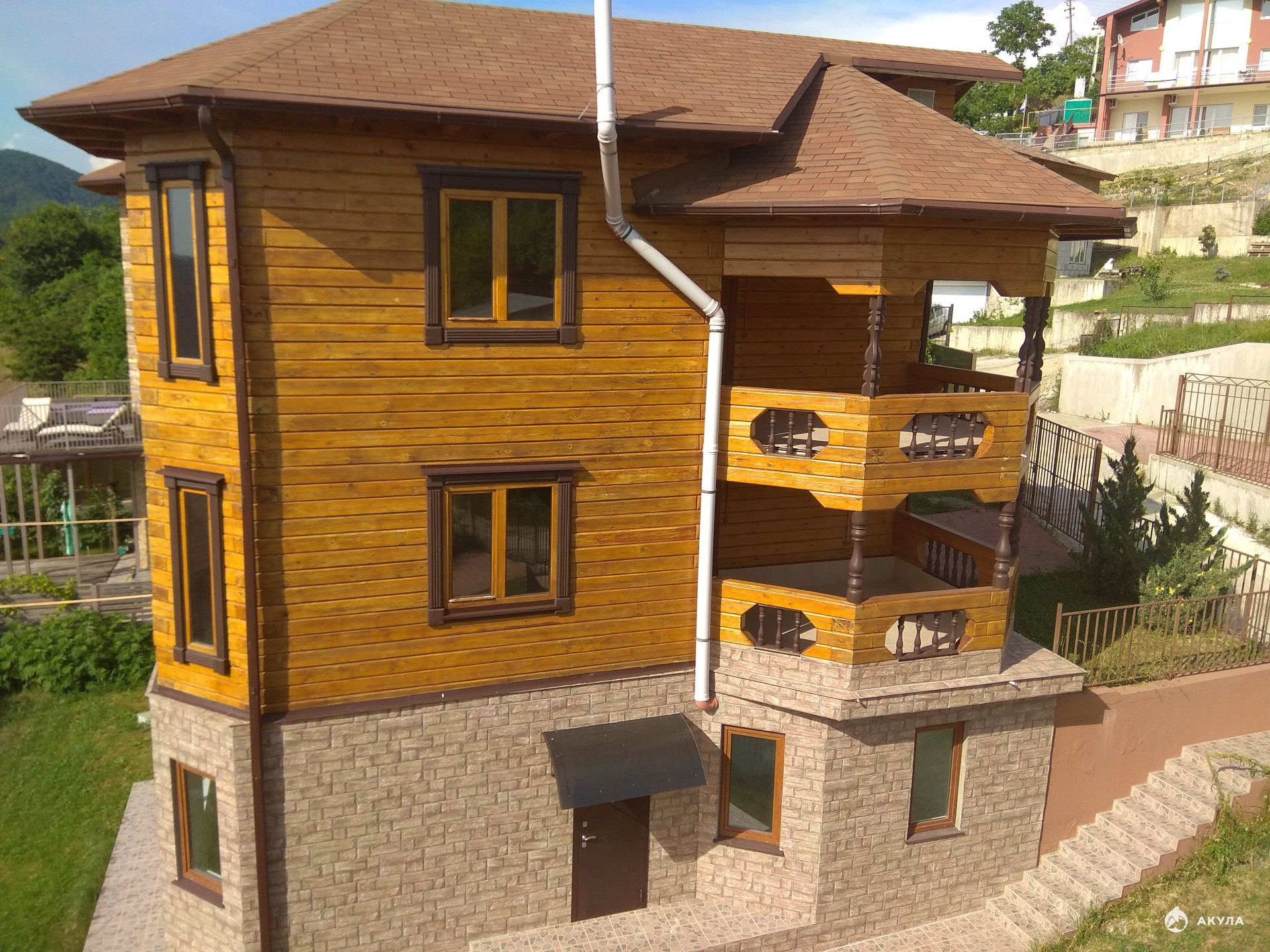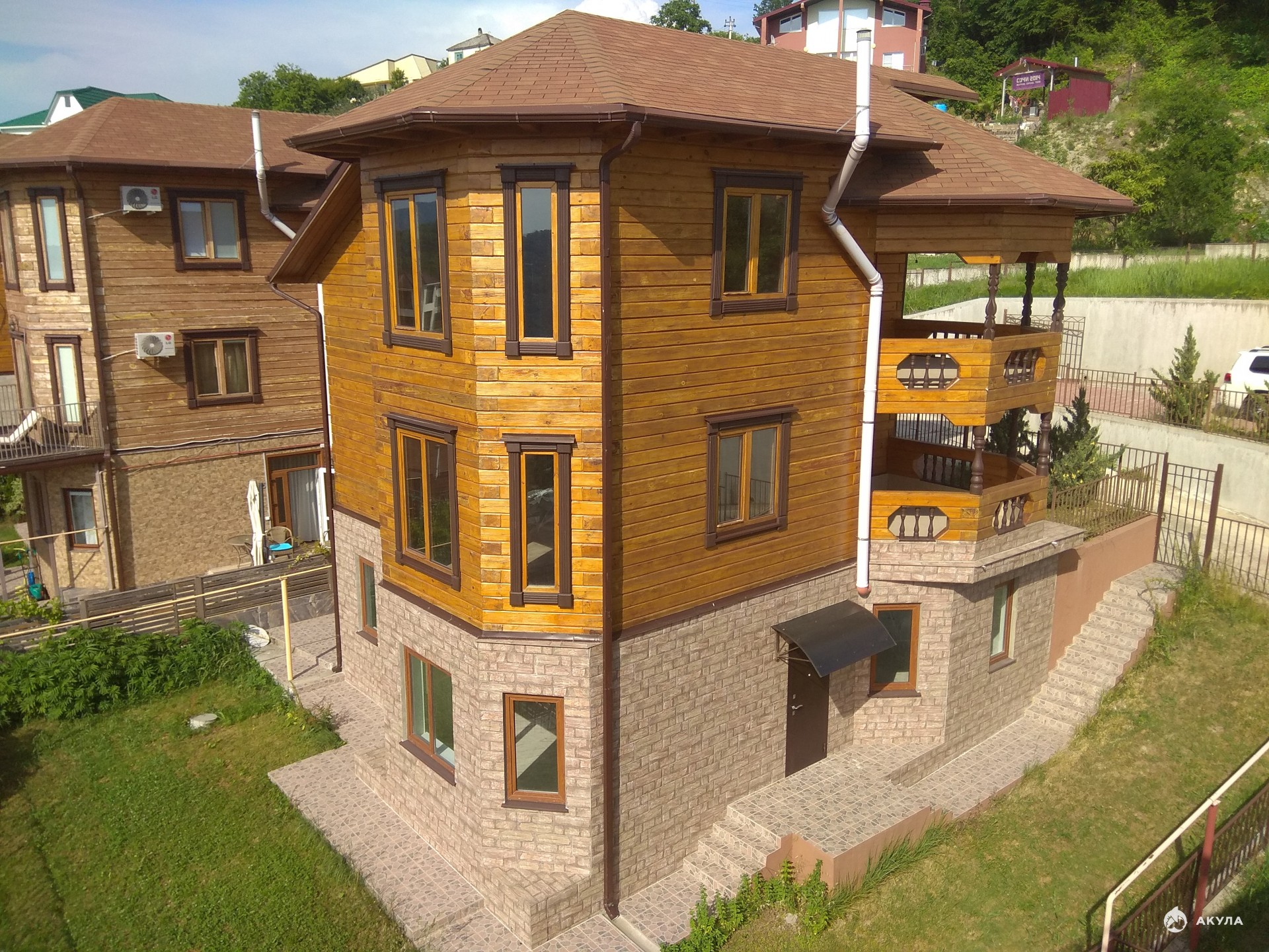 На улице Целинной в центральном районе Сочи на продажу выставлен 3-х этажный коттедж площадью 232 м2 с видом на море. Первый этаж монолитный, второй и третий этажи построены из кедра, специально привезенного из Сибири - из Томска. Коттедж имеет кухню и семь комнат, а также три санузла, по одному на каждом этаже. На втором этаже из комнаты есть выход на террасу. Третий этаж также имеет свою террасу. Полностью сделан ремонт под ключ, заноси мебель и можно жить. Коммуникации центральные, в коттедж заведен газ. Отопление и горячая вода от двухконтурного газового котла производства Италии, установленного в доме. Канализация -индивидуальный септик. Огороженная территория с парковкой и с зоной барбекю. Земельный участок 4 сотки. Тихое спокойное, тупиковое место, из шума только пение птиц. До остановки общественного транспорта и магазина 250 метров. До центра Сочи Мор-порт 10 минут на машине, до моря 10 минут.