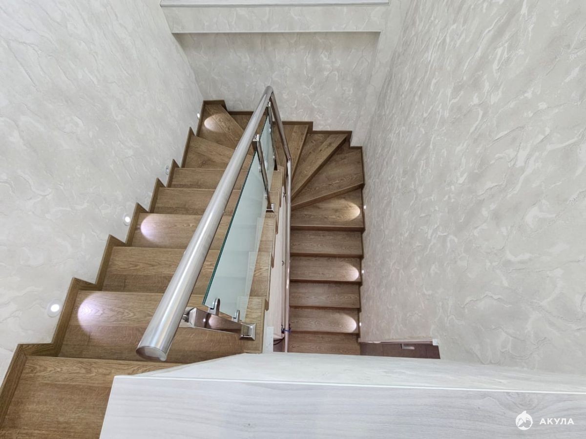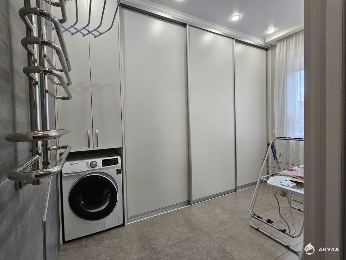 На первом этаже большая кухня-гостиная, прачечная с гладильной, спальня, ванная комната. На втором этаже: ванная, 2 спальни и гостиная.