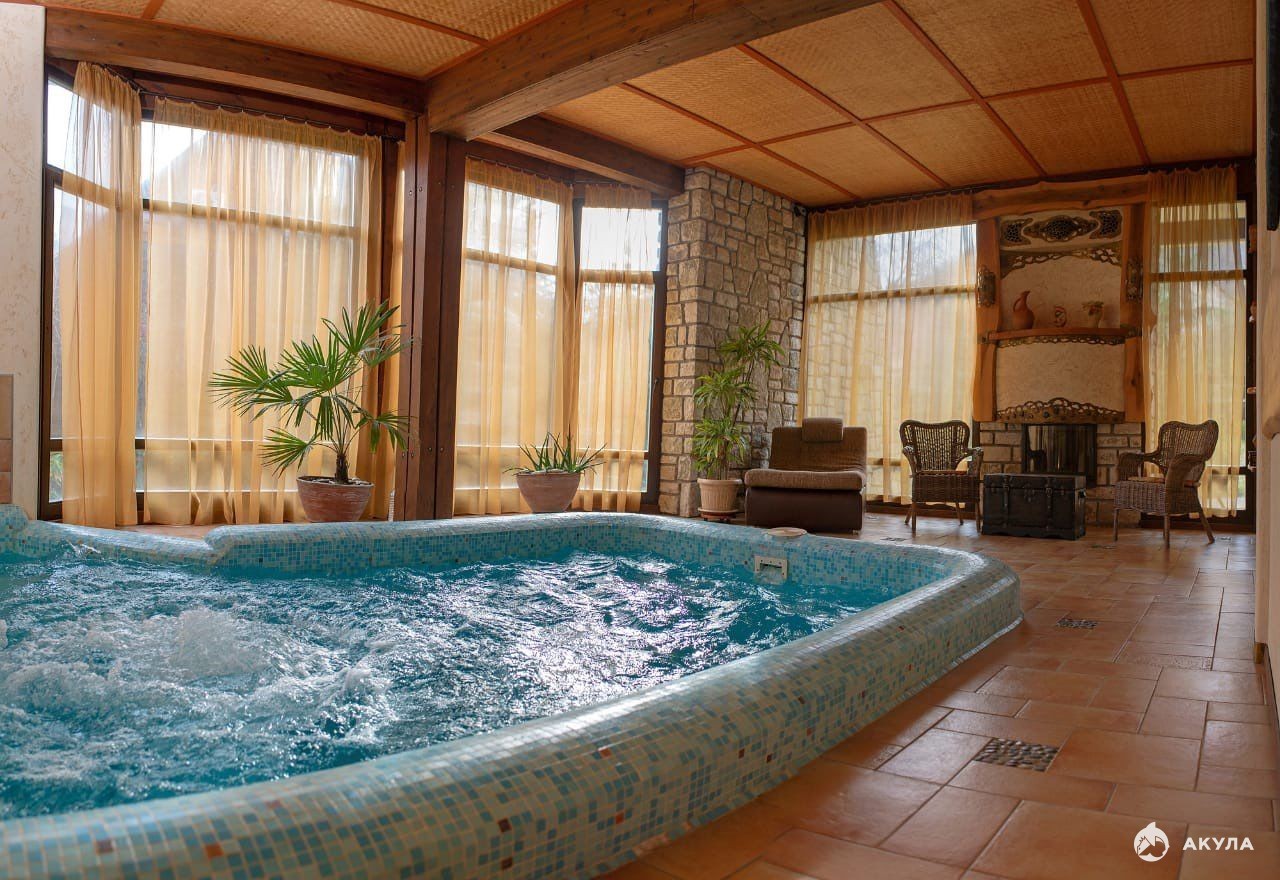 Имеется: хамам, небольшой бассейн внутри, большая комната отдыха с камином, tv и выходом на террасу на которой можно отдыхать и любоваться верхушками гор.