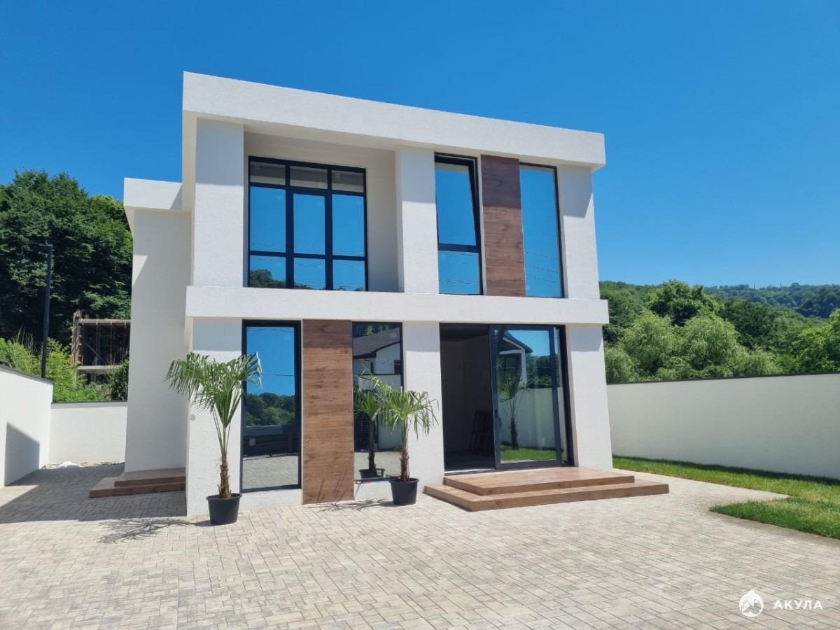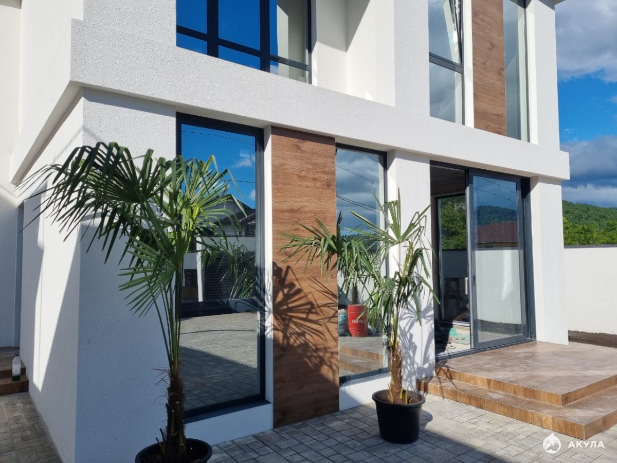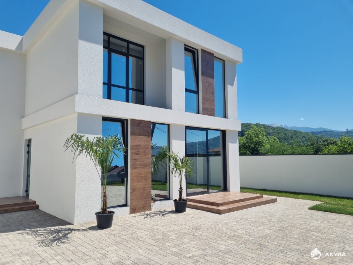 В дом заведен свет, вода, газ, септик. Предчистовая отделка, алюминиевые окна, озеленение. Дом новый, вид на горы и форелевое хозяйство, 200 метров от федеральной трассы. Один собственник.