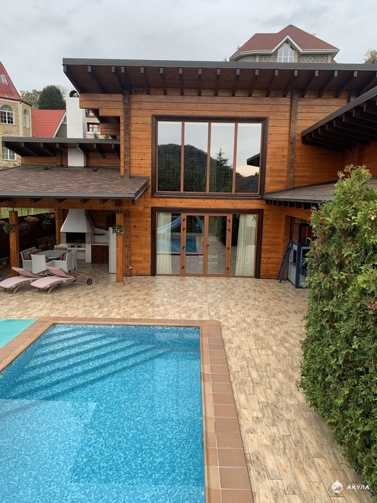 У бассейна расположена большая детская игровая зона, спортивная зона и место, где можно загорать 7 месяцев в году у собственного бассейна. Летняя кухня имеет все условия для приема больших компаний и приготовления вкусных блюд, Мангальная и тандыр позволят проявить больше кулинарных способностей.