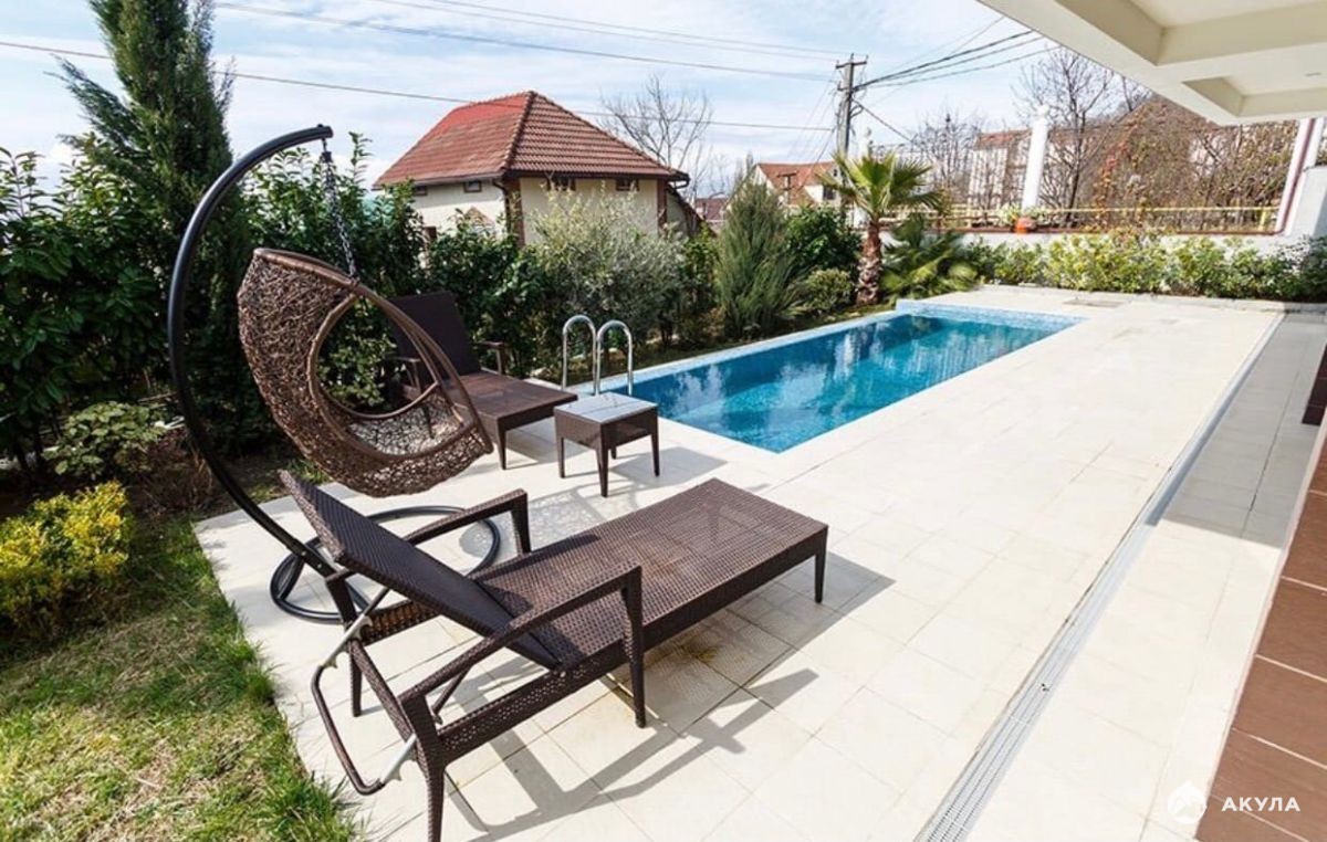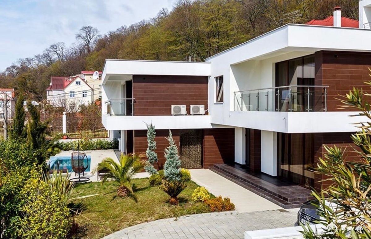 Cовременный коттедж с бассейном на "Благодати", неподалеку от отеля Radisson SAS Lazurnaya. Поистине идеальное предложение для любителей жить в полной гармонии с окружающей природой! Район очень спокойный, до оживленных автомагистралей -1.5км(15 мин ходьбы). Развитая инфраструктура: в 10мин ходьбы - престижная 57 гимназия, остановка общественного транспорта, до центра Сочи от силы 10 минут езды. Интерьер выполнен в очень популярном стиле Хай-Тек, немецкая техника, ландшафтное озеленение-растения привезены из Италии. Огороженная забором территория, рядом национальный парк. Отличный подъезд. Со двора и со всех этажей прекрасный панорамный вид на море. 1эт- холл, кухонная зона, с/у, подсобная+котельная, 2эт-2 спальни(одна с гардеробной) с с/узлами и террасами. 3эт-2 спальни с террасами, кабинет, 1 с/у. Все спальни с террасами, светлые, просторные.