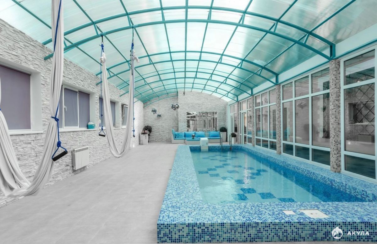 На территории отдельно стоящий бассейн с противотоком и с зоной отдыха. Зона барбекю.