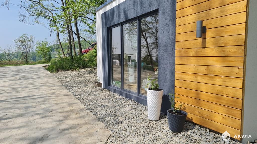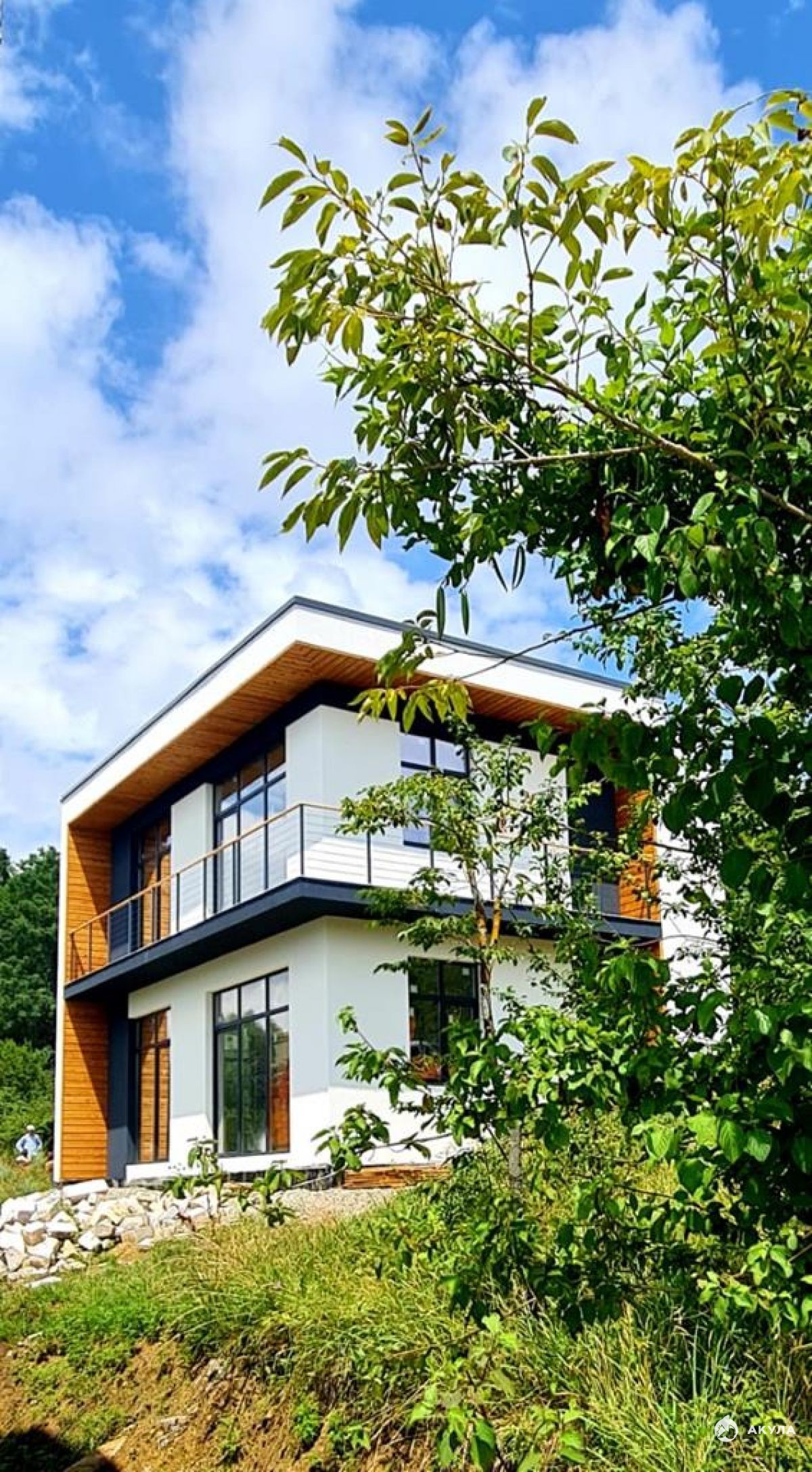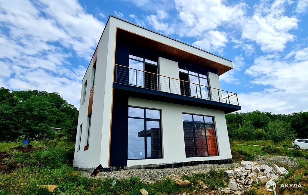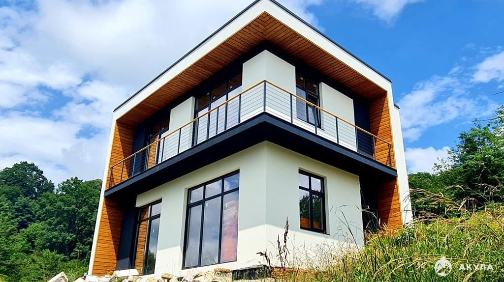 Монолитный каркас дома, стены керамзитный блок. Витражные высококачественные алюминиевые окна. Общая площадь 170 м² включая террасу 32 м², полезная площадь 139 м², эксплуатируемая кровля 68 м² (не входит в общую площадь).