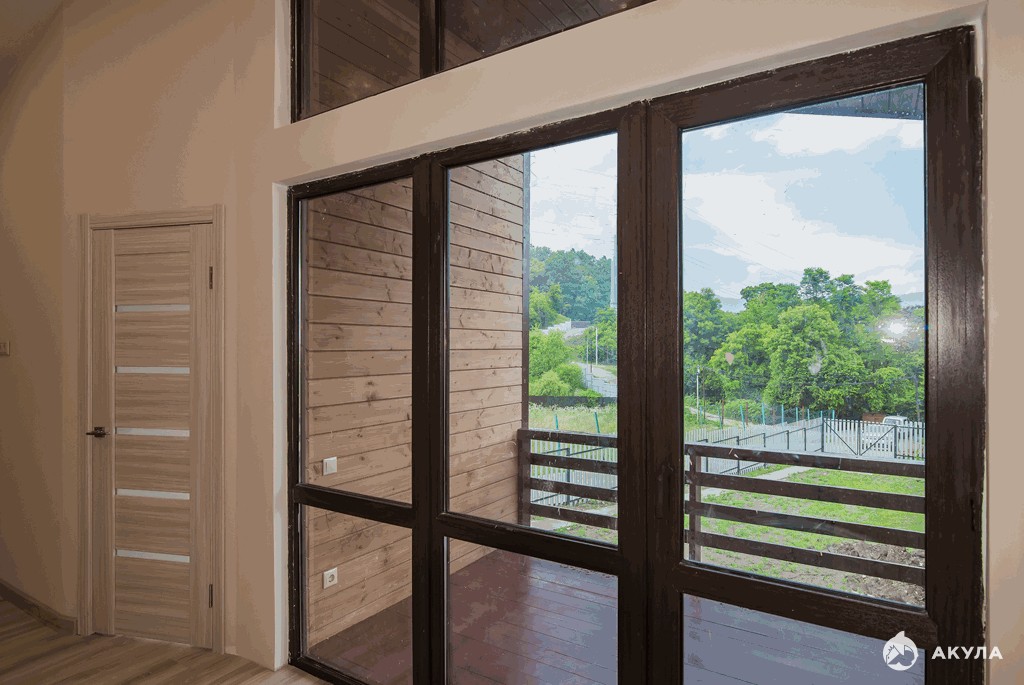 Дом каркасный из деревянного бруса привезенного из Кировской области, утепление — каменная вата. Установлены энергосберегающие панорамные окна премиум класса. Крыша скатная металлочерепица.