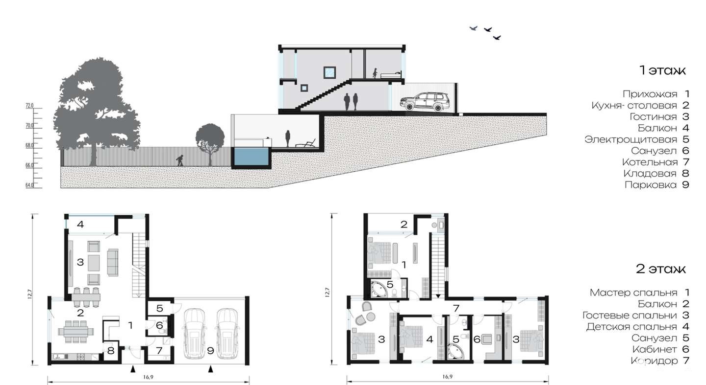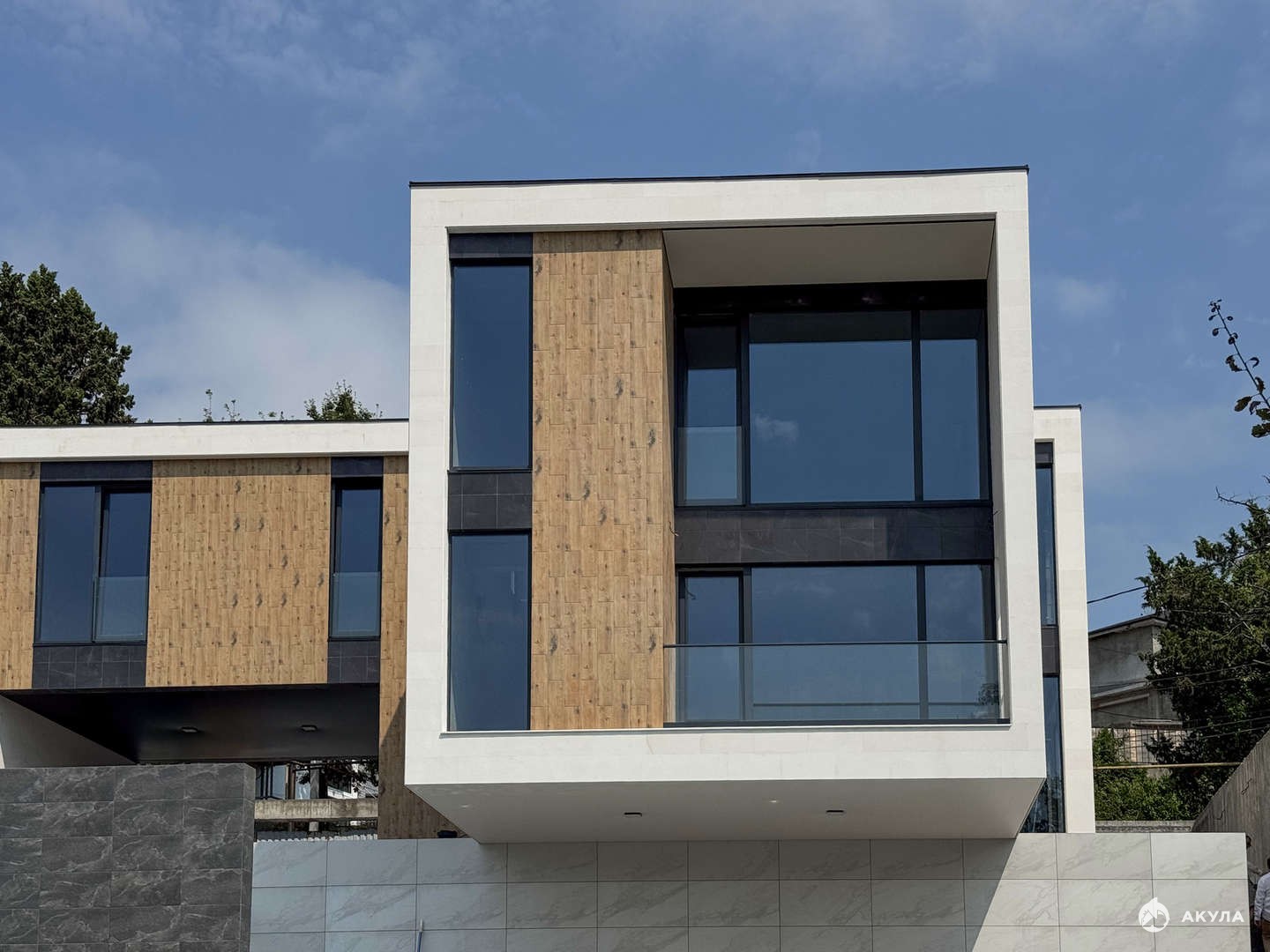 Современный архитектурный проект с высокими потолками и панорамным алюминиевым остеклением.