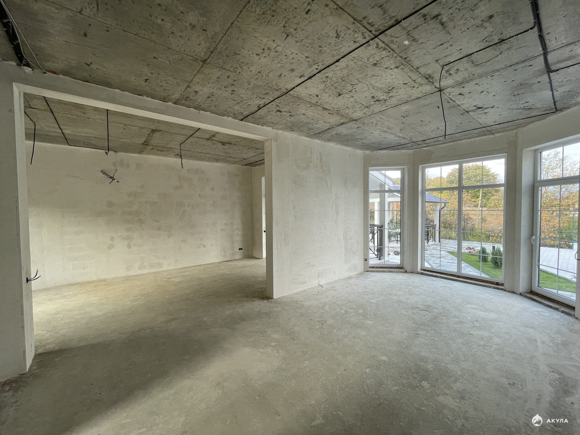 Внутри выполнена предчистовая отделка. Дом двухэтажный. На первом этаже свободная планировка, на втором выделено три спальни и санузел.