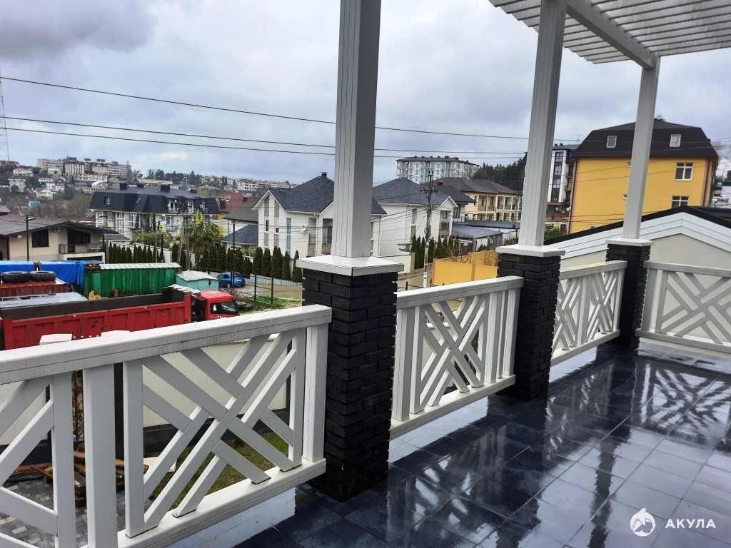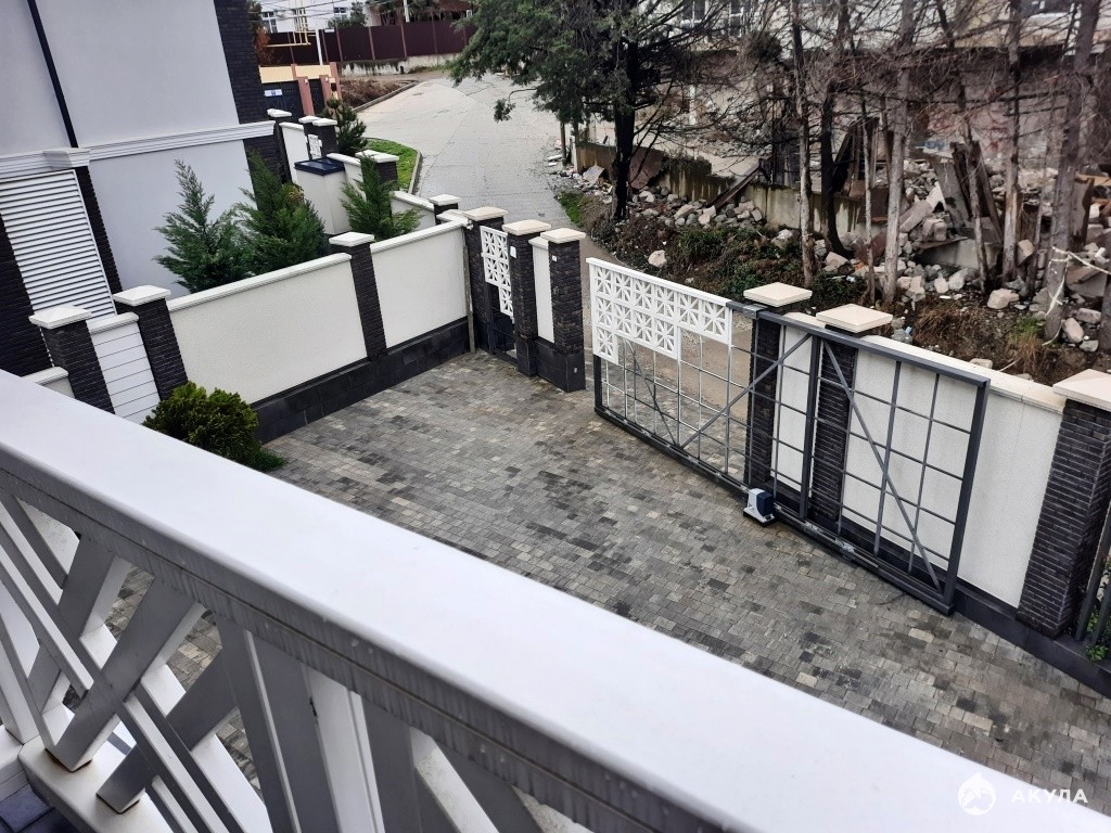 Капитальный забор, выполненный в едином архитектурном стиле, архитектурная подсветка здания, крытая зона барбекю, озеленение, система водополива.