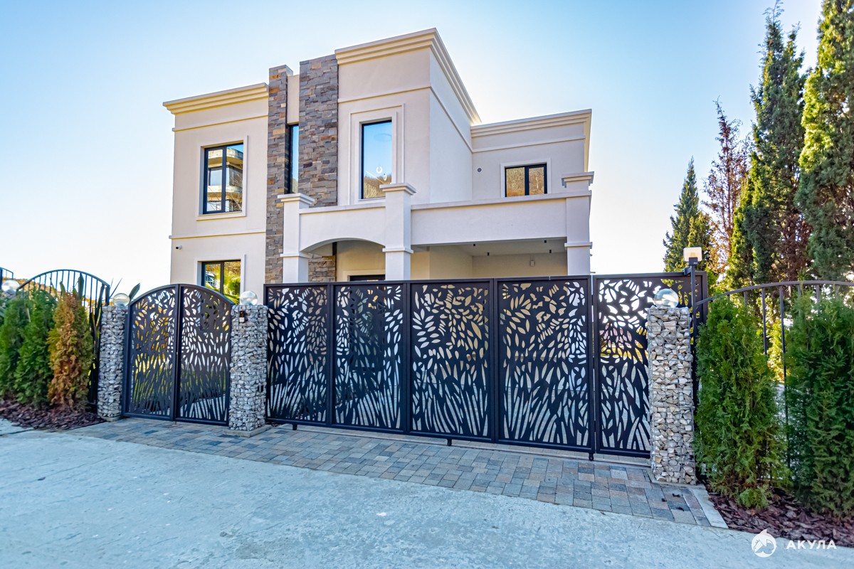 Площадь дома 345 м2, включает в себя холл со вторым светом высота потолка 7м, 2 спальни с видом на море, 2 кабинета с возможностью переоборудования в спальню, кухня-гостиная, 5 санузлов в каждой комнате и гостевой на первом этаже, большой балкон примыкает к мастер спальне и имеет роскошный вид на море, лес, горы. Под домом двадцать две сваи диаметром 530 мм 6 свай под бассейном, толщина стен 300 мм. Применены на фасаде: мраморная крошка и уральский камень Серицит.