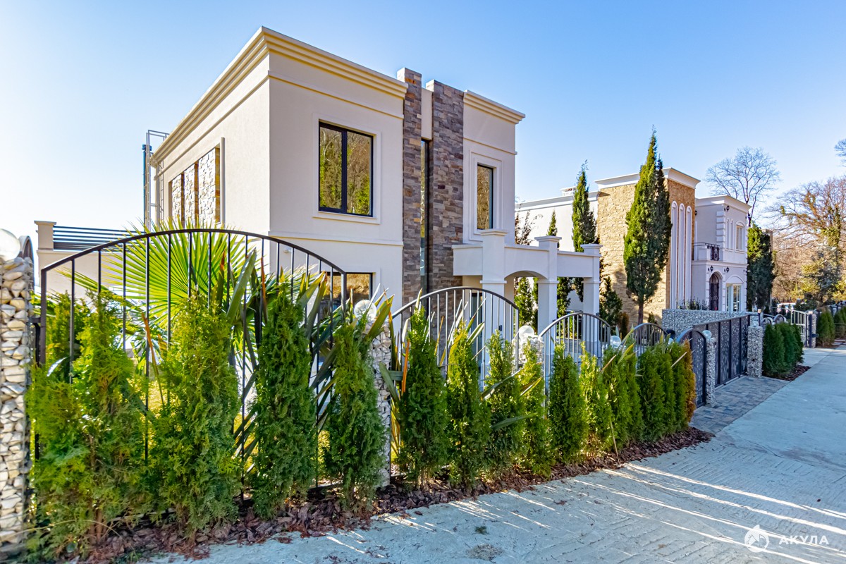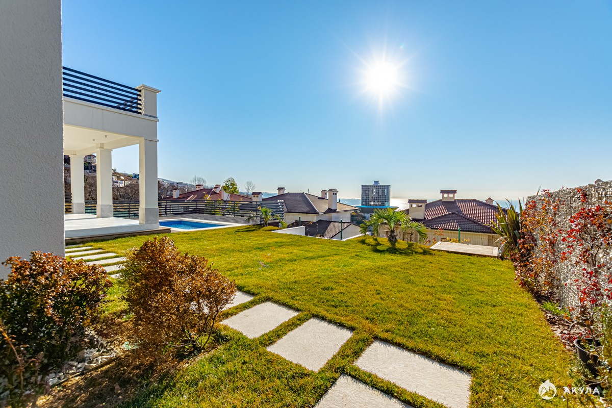 Изумрудный элитный газон; многочисленные вечнозеленые растения кипарисы, туи, самшиты, лен новозеландский, вьющийся жасмин, пальмы вашингтония, хамеропс; бассейн с террасой из лиственницы; файер плейс – посидеть приятной компанией у открытого огня; крытая просторная терраса с зоной барбекю и видом на море, лес и Олимпийский парк украсит не только отпуск, а так же трудовые будни и вечера владельцев дома.