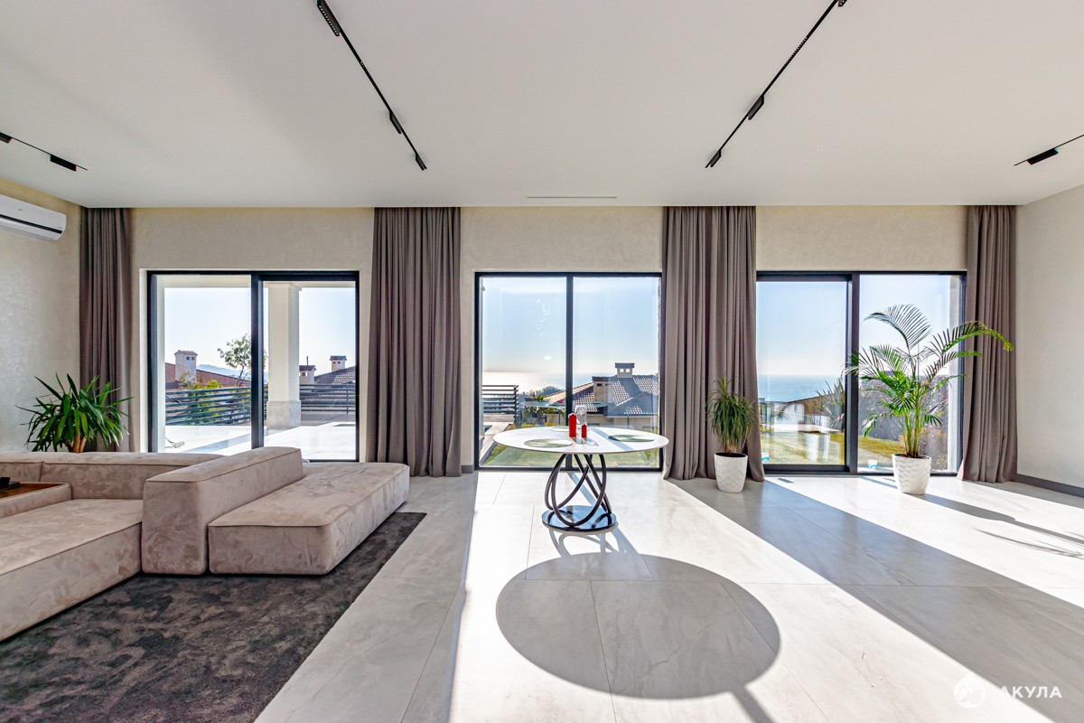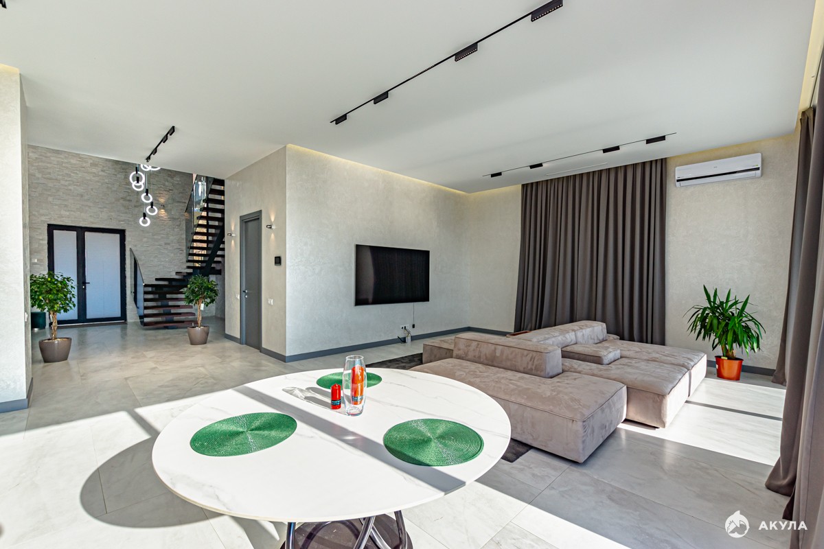Светлые тона интерьера и огромные окна включая второй свет дарят неповторимое ощущения легкости, воздушности и при этом тепла и уюта в современной минималистичной стилистике интерьера дома. Вам будет приятно находится в стенах этого дома, наполненного заботой о владельце грамотные планировочные решения, хорошо подобранная бытовая техника, роскошная TV зона – 85 дюймовый телевизор, четырёхсторонний диван LEMA Cloud.