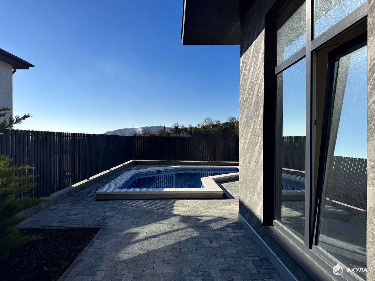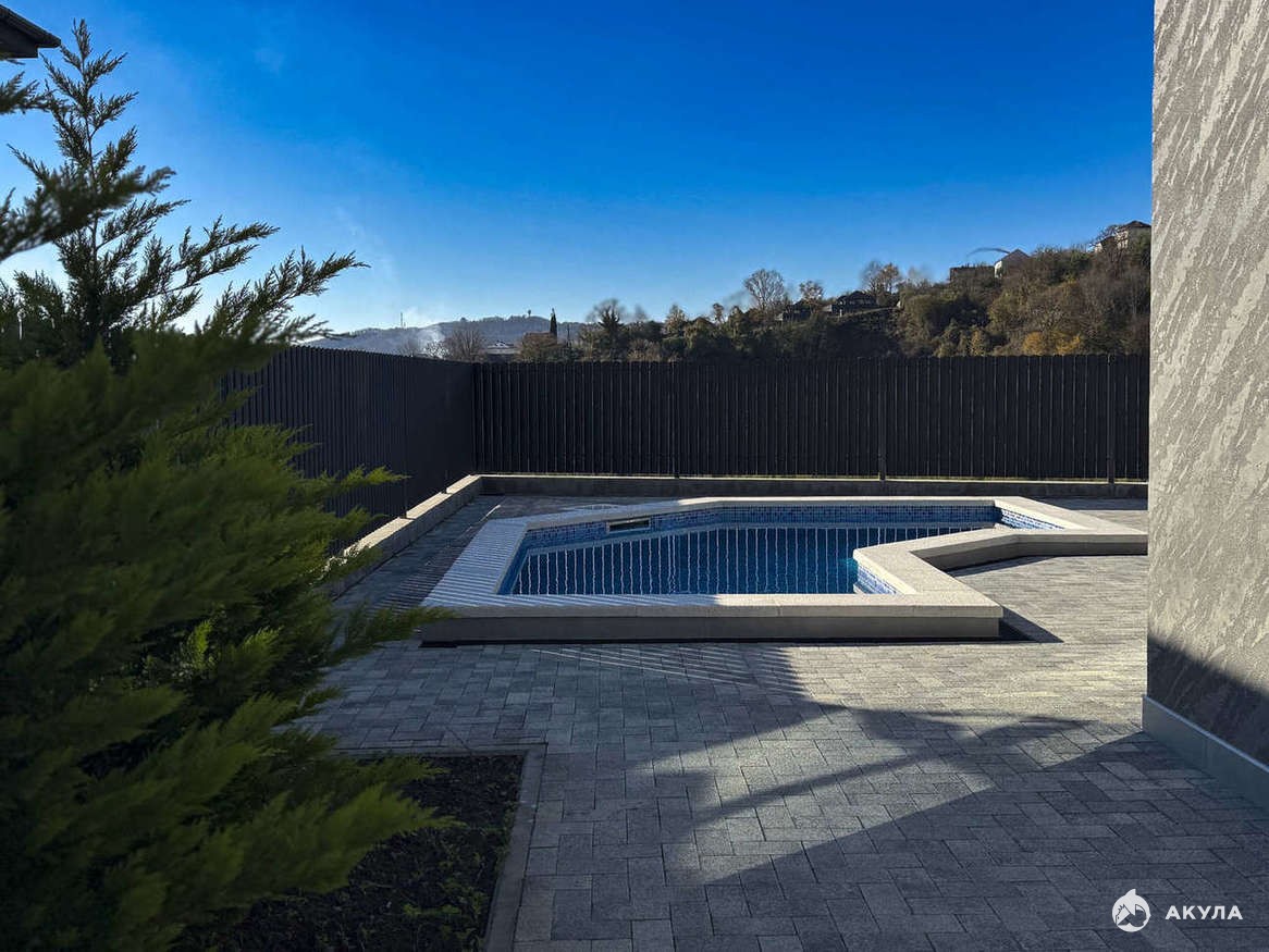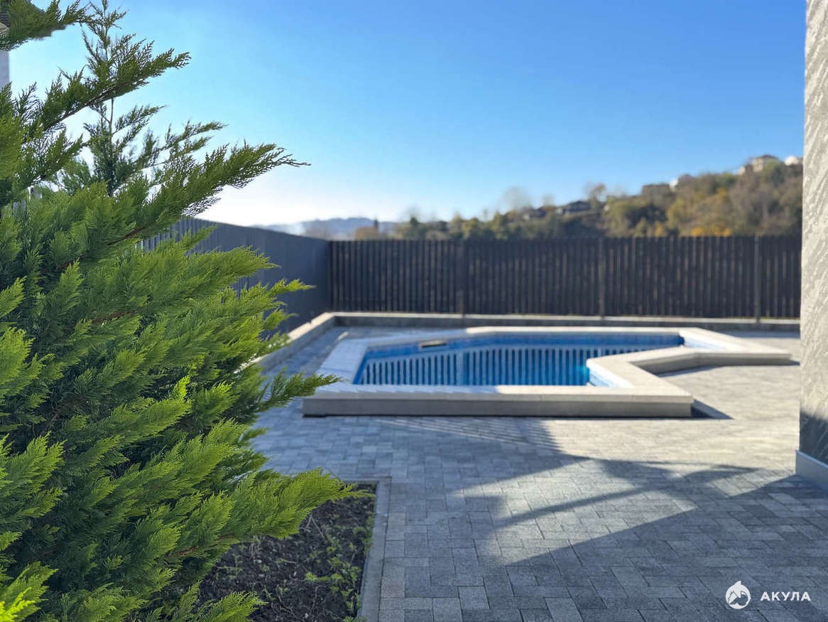 На территории установлен круглогодично-подогреваемый бассейн, зона отдыха и выполнено ландшафтное озеленение.