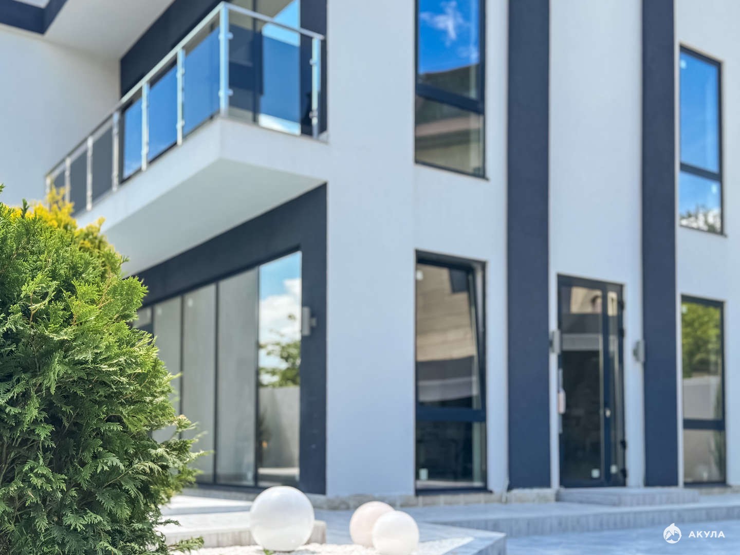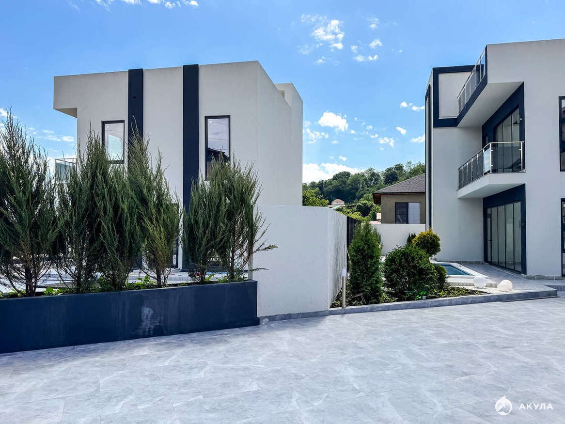 Архитектура домов современная, фундамент выполнен на сваях. Фасад из декоративной камешковой штукатурки с декоративными элементами и архитектурной подсветкой. Алюминиевый панорамный профиль окон дарит пространству много естественного света.